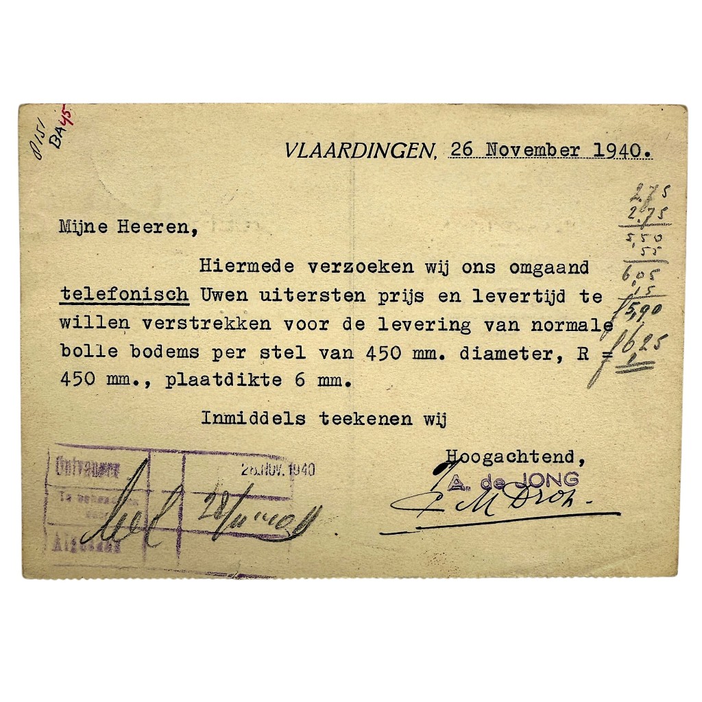This Dutch postcard from the Second World War, sent on 26 November 1940 by A. de Jong, Machine Factory and Construction Workshop Vlaardingen, to the N.V. Tank Factory in Geertruidenberg.