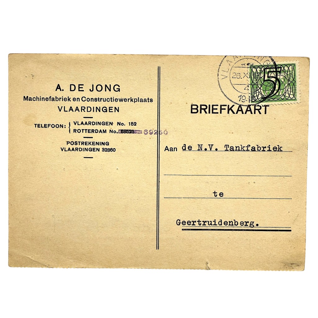 Deze Nederlandse briefkaart uit de Tweede Wereldoorlog, verstuurd op 26 november 1940 door A. de Jong, Machinefabriek en Constructiewerkplaats Vlaardingen, aan de N.V. Tankfabriek in Geertruidenberg.