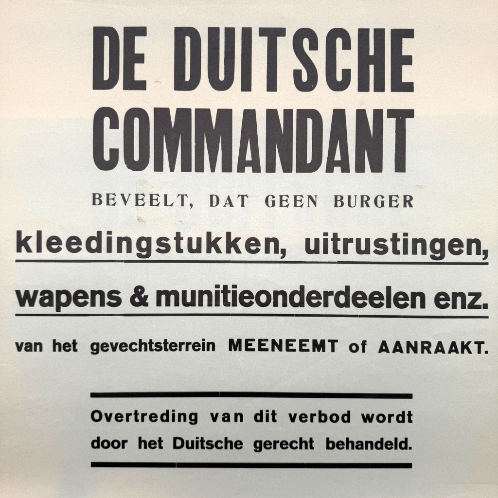Originele bekendmakingsposter uit de Tweede Wereldoorlog, uitgevaardigd door de Duitse bezetter in Nederland. Op deze affiche staat in het Nederlands te lezen dat “De Duitsche Commandant” beveelt dat geen burgers kledingstukken, uitrustingen, wapens of munitieonderdelen van het gevechtsterrein mogen meenemen of aanraken.