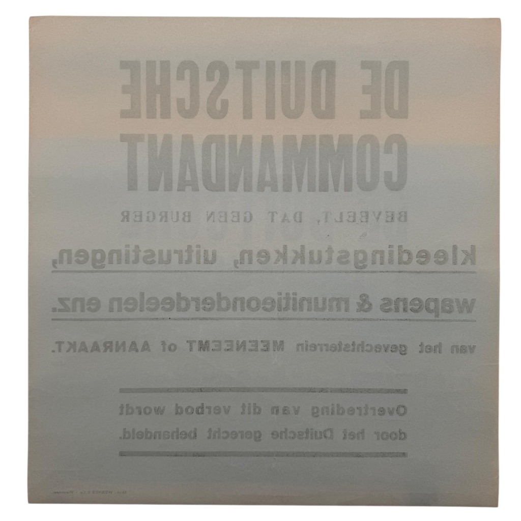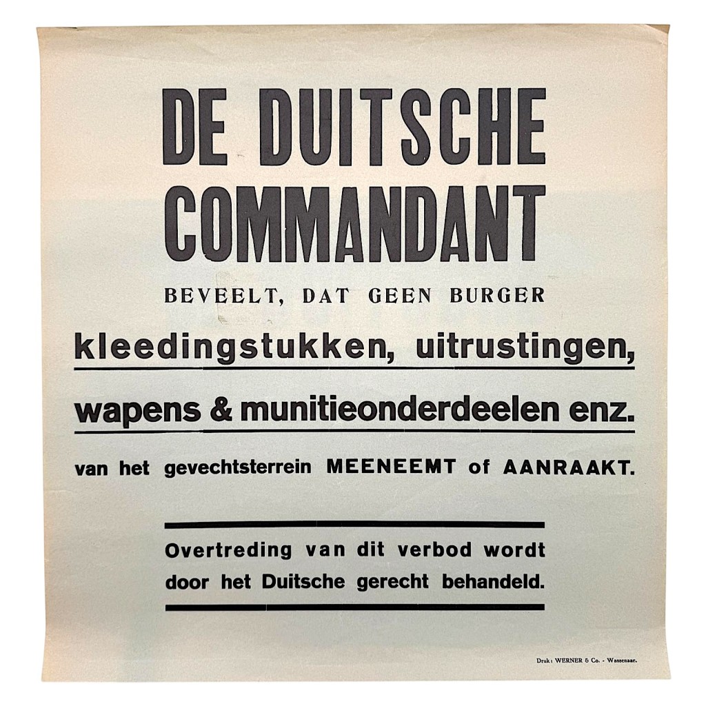 Original public notice poster from the Second World War, issued by the German occupying forces in the Netherlands. This poster states in Dutch that “The German Commandant” orders that no civilians are allowed to take or touch clothing, equipment, weapons, or ammunition parts from the battlefield.