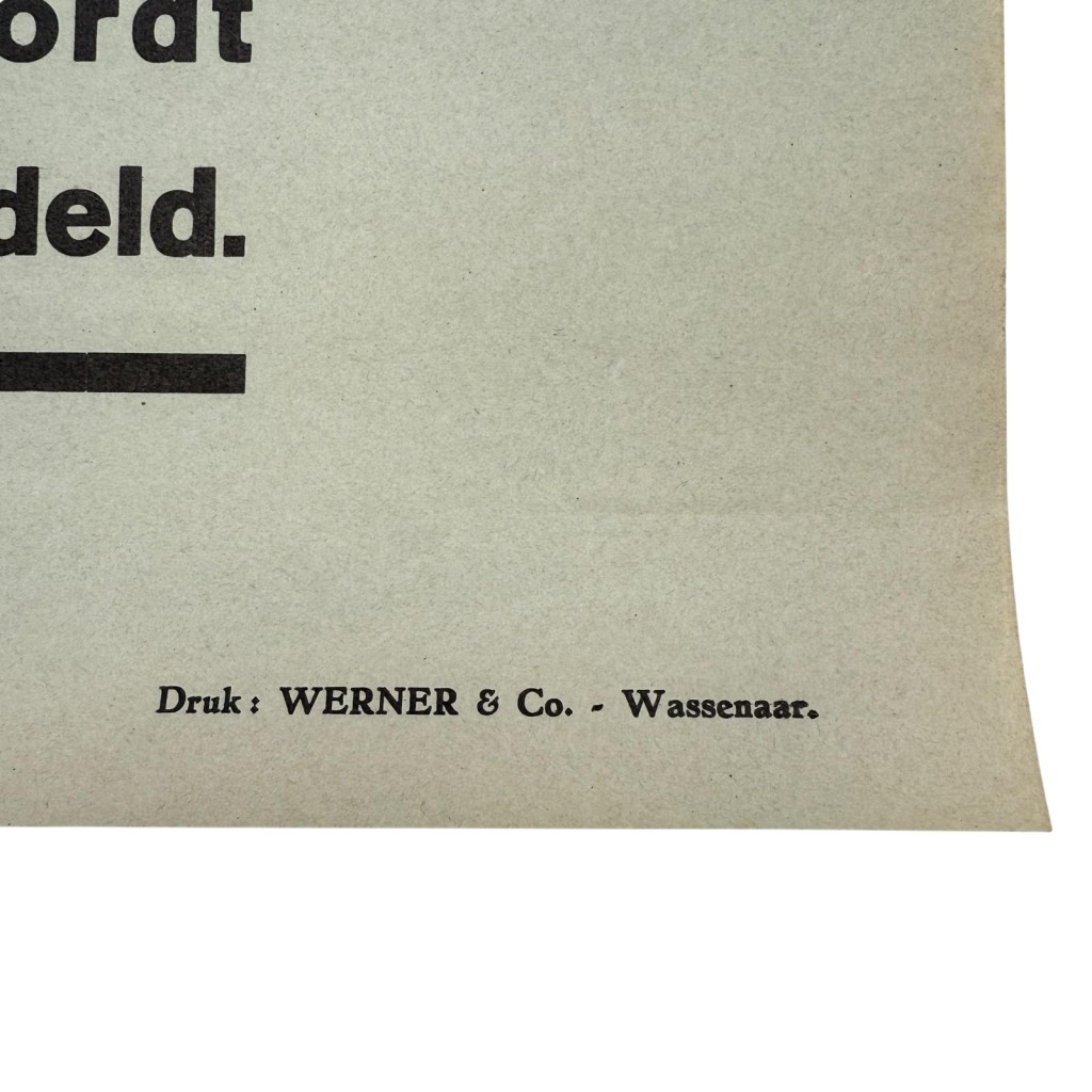 Drukker: “Druk: Werner & Co. – Wassenaar.” Met een formaat van 45,5 x 44 cm is dit een opvallend en goed leesbaar stuk. Het vormt een tastbaar historisch document dat de bezettingsmaatregelen en de gespannen sfeer van die periode weerspiegelt, en is een bijzonder verzamelobject voor liefhebbers van oorlogsgeschiedenis, propaganda en originele WOII-memorabilia.