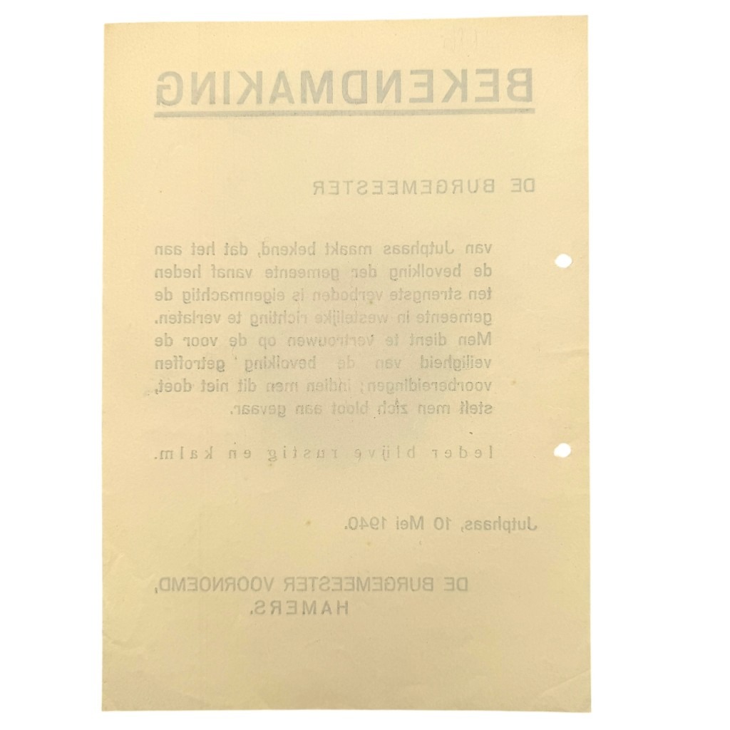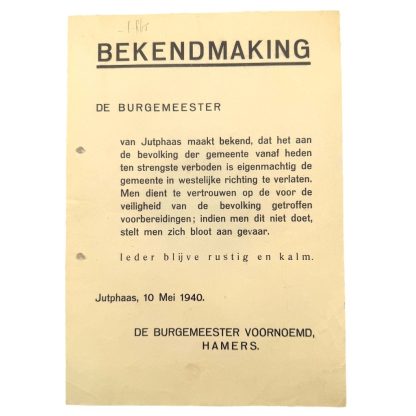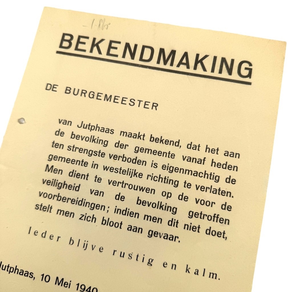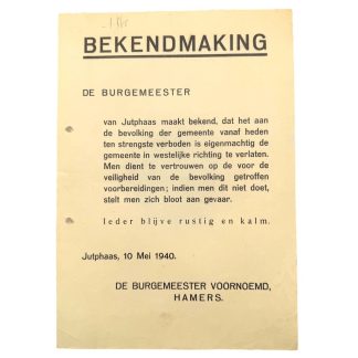 This Dutch poster is in good condition, dated May 10, 1940 and contains information that the Dutch population was not allowed to move westward during the German invasion of the Netherlands at Jutphaas.