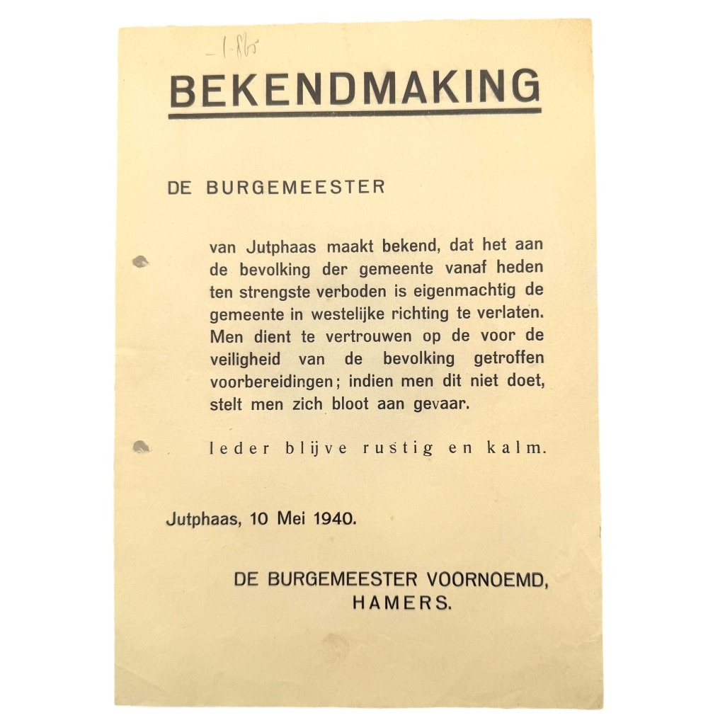 Deze Nederlandse poster is in goede conditie, dateert van 10 mei 1940 en bevat informatie dat de Nederlandse bevolking zich niet westwaarts mocht bewegen tijdens de Duitse invasie van Nederland in Jutphaas.