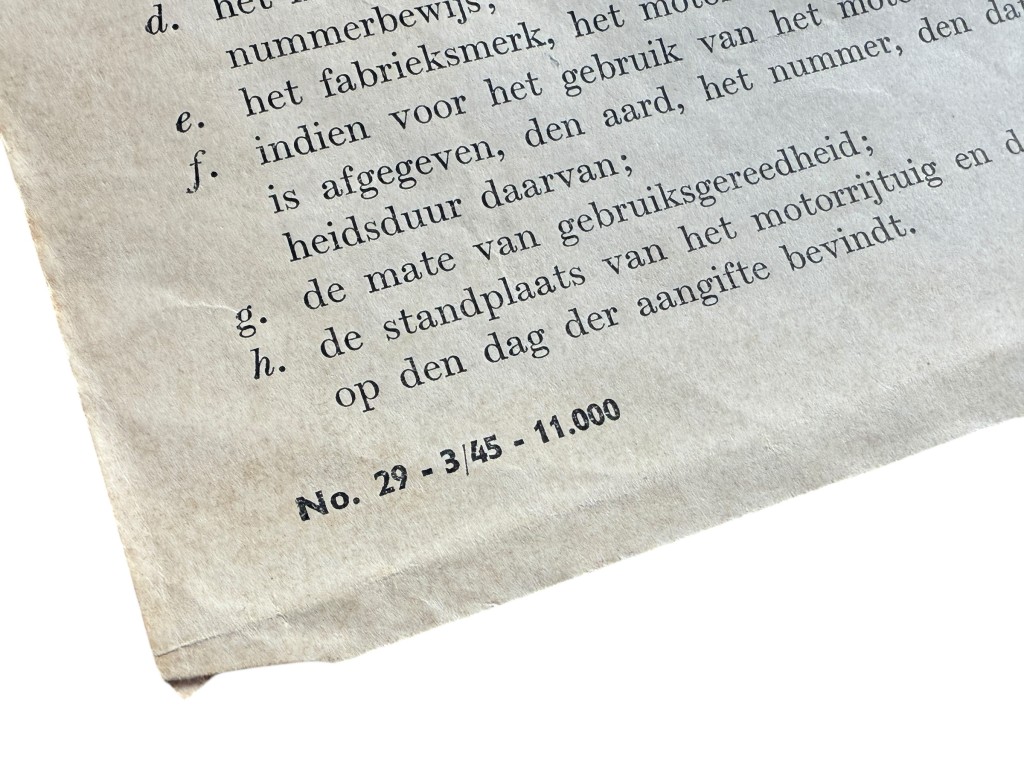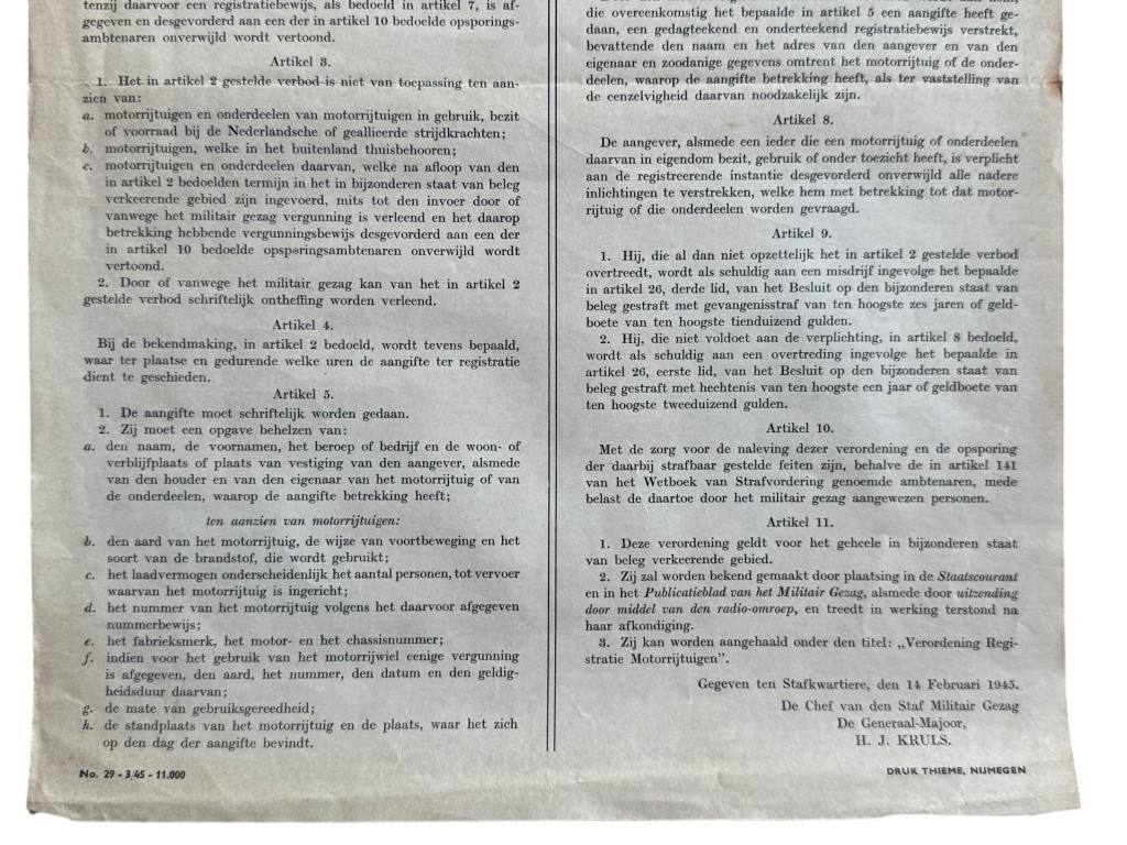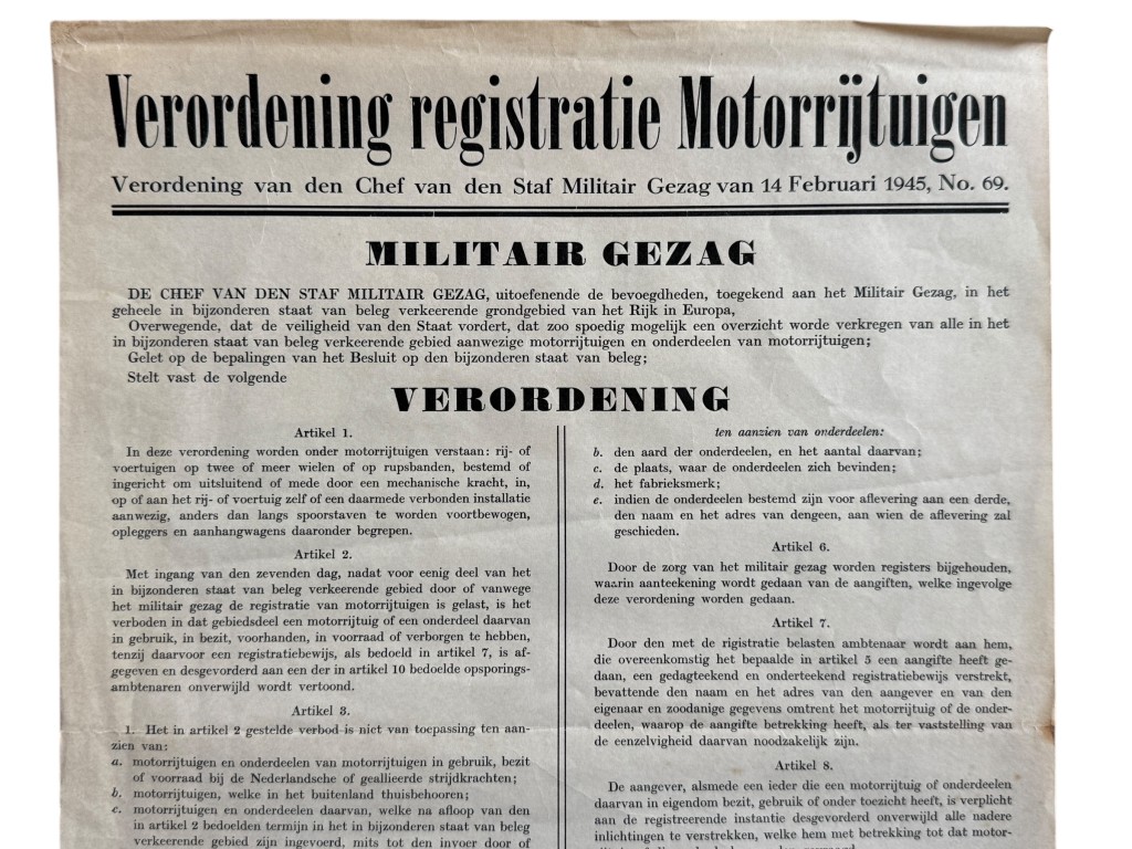 Titled “Regulation on the Registration of Motor Vehicles”, it was decreed by the Chief of Staff of the Military Authority, Major General H.J. Kruls, and concerns the obligation to register motor vehicles and their parts in liberated areas.