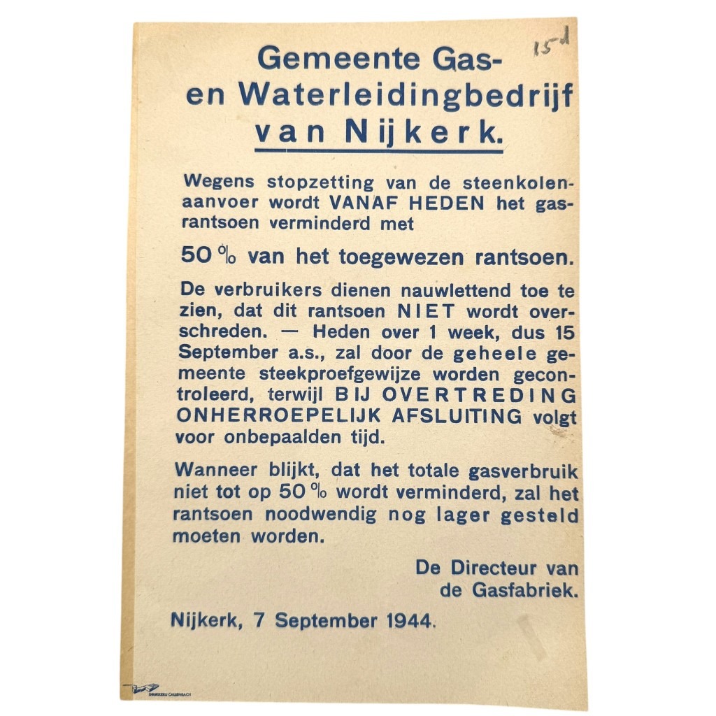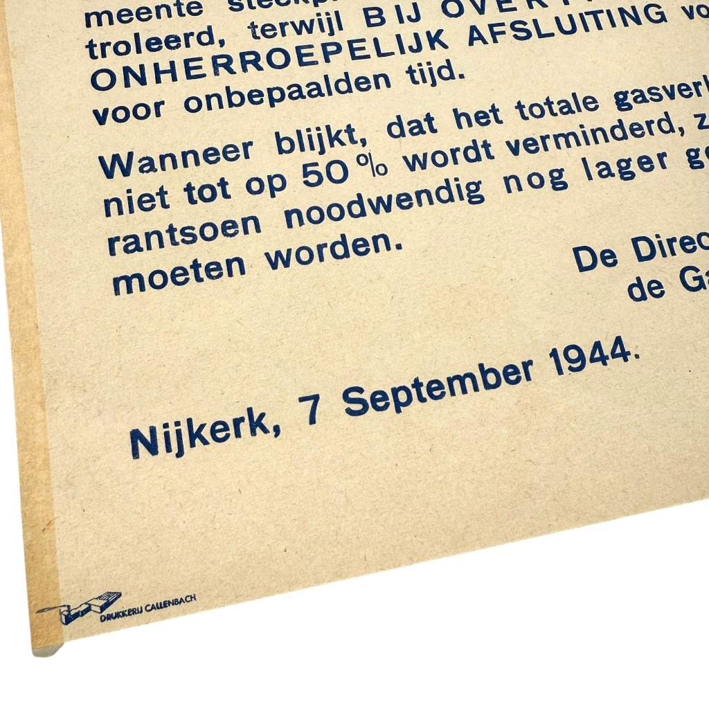 This Dutch poster is in good condition, dated September 7, 1944 and contains information about the gas rations in the town of Nijkerk.