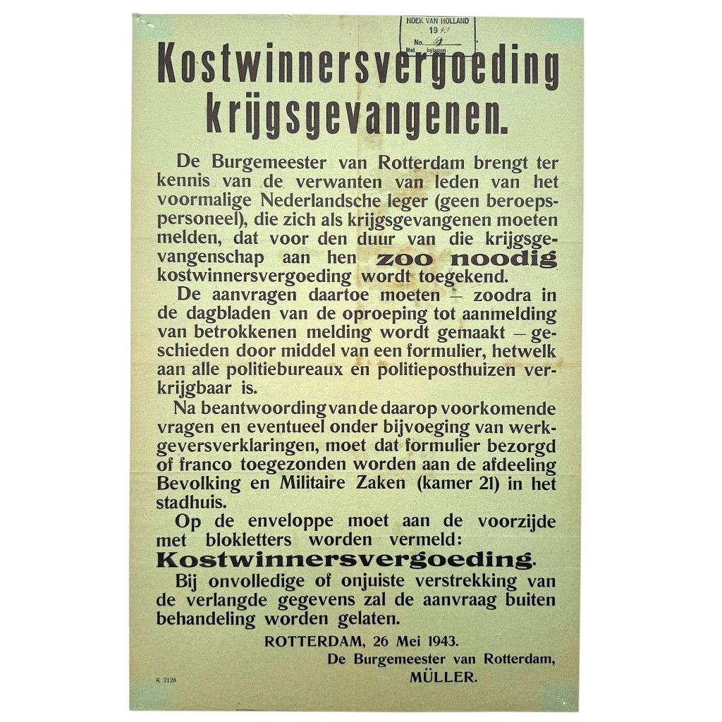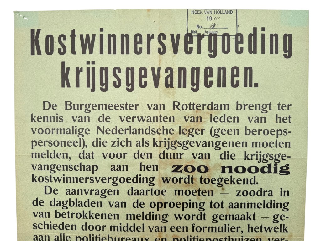 Issued by the mayor of Rotterdam, the poster informs the families of former soldiers of the Dutch army that, for the duration of their imprisonment, a breadwinner’s allowance may be granted if necessary.
