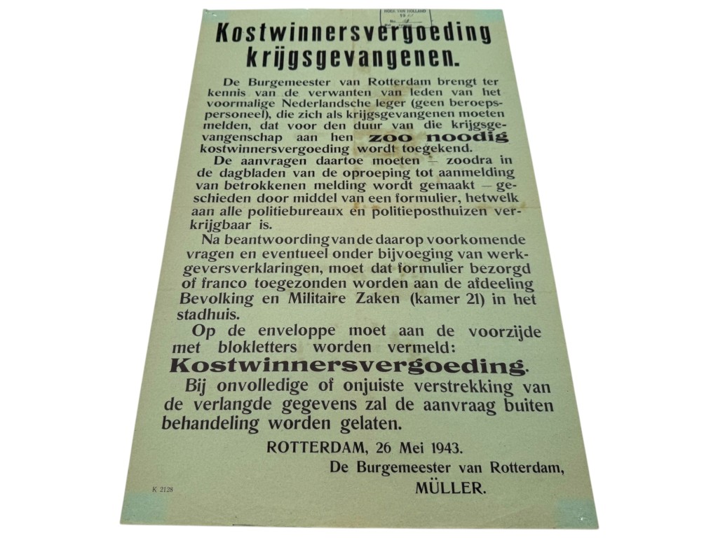 Deze Nederlandse bekendmakingsposter uit 1943 betreft een officieel bericht over de kostwinnersvergoeding voor krijgsgevangenen en is een historisch document uit de bezettingstijd. De poster, uitgegeven door de burgemeester van Rotterdam, informeert de familieleden van voormalige militairen van het Nederlandse leger dat voor de duur van hun krijgsgevangenschap indien nodig een kostwinnersvergoeding kan worden toegekend. De tekst geeft duidelijke instructies voor het indienen van aanvragen, inclusief het verkrijgen van formulieren bij politieposten, het aanleveren van eventuele werkgeversverklaringen en het opsturen van de stukken naar de afdeling Bevolking en Militaire Zaken in het stadhuis. Onderaan is de datum 26 mei 1943 vermeld, met de officiële ondertekening door burgemeester Müller.