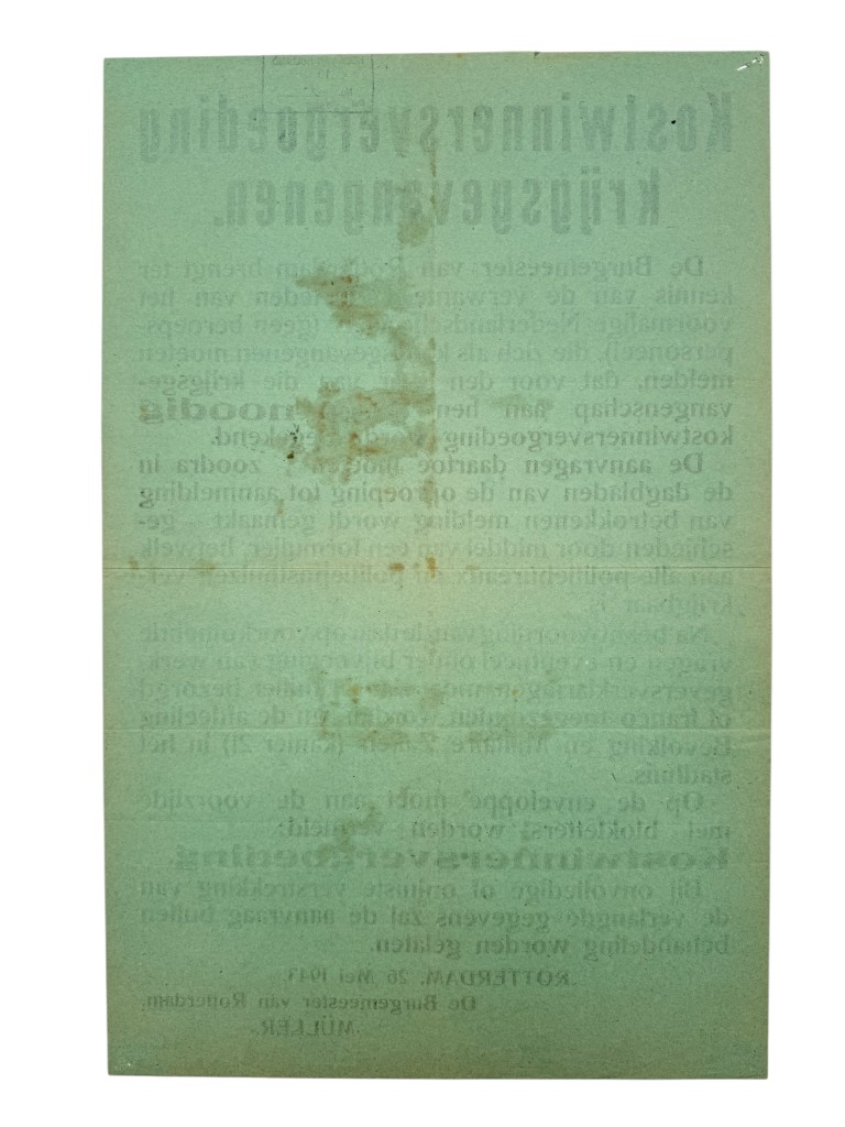 Een interessant stuk voor de gespecialiseerde verzameling van WOII-bezettingsdocumenten, posters en historisch oorlogsmateriaal.