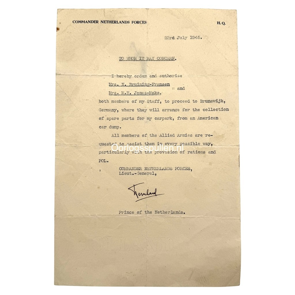 Written on official Commander Netherlands Forces letterhead, the document bears the original signature of Prince Bernhard. It remains in its original condition with light folds and signs of age, and represents a rare and remarkable historical artifact for collectors of Second World War documents, the Dutch Royal Family, or military memorabilia.