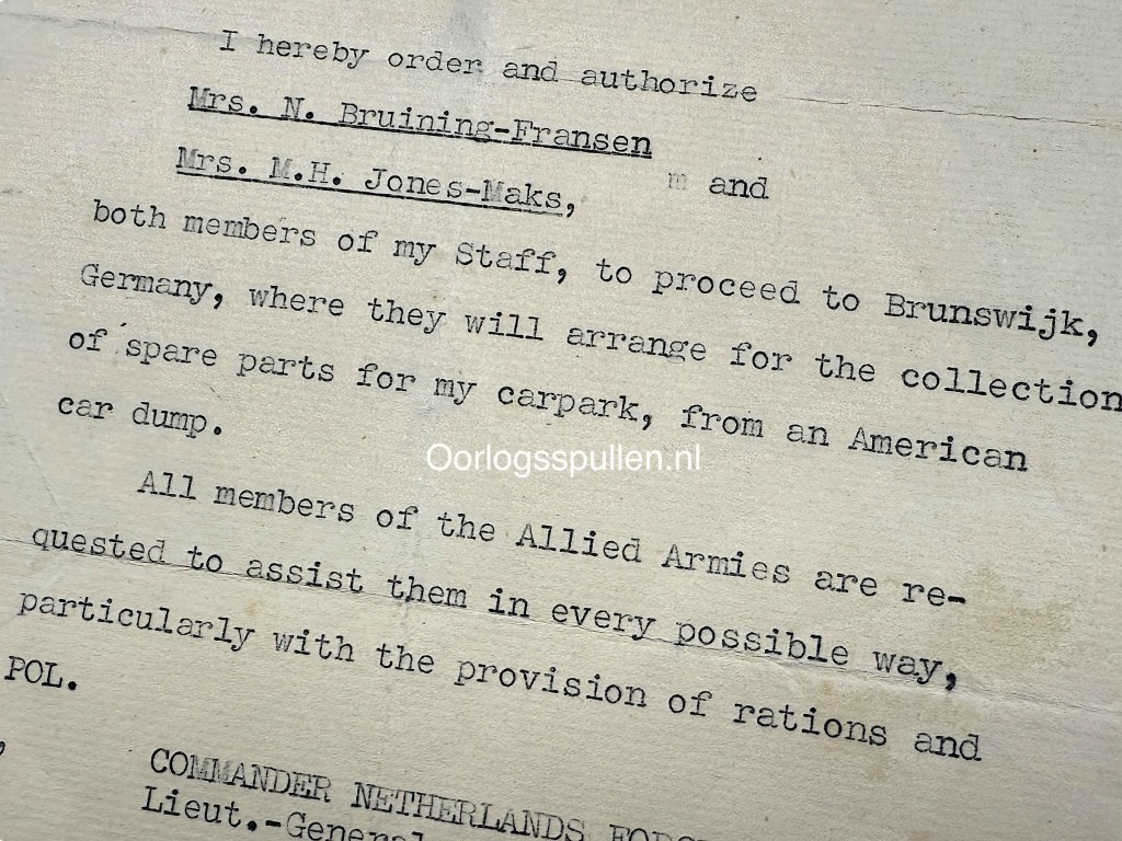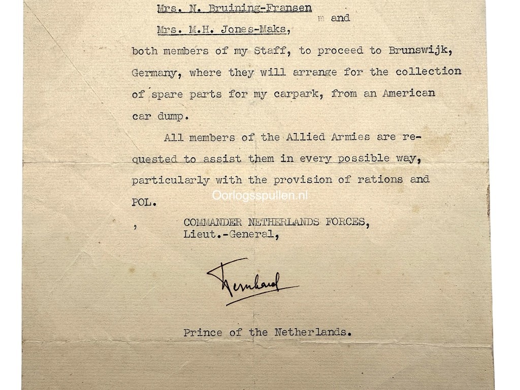 In deze getypte order autoriseert Bernhard twee leden van zijn staf, Mrs. A. Bruning-Erransen en Mrs. H.H. Jones-Hake, om naar Braunschweig in Duitsland te reizen voor het ophalen van reserveonderdelen uit een Amerikaans autodump ten behoeve van zijn wagenpark.
