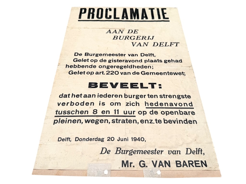 Originele WWII Nederlandse proclamatie poster Delft 1940