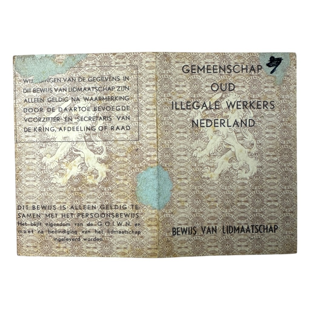 Deze ‘Gemeenschap Oud Illegale Werkers Nederland’ lidmaatschapskaart is in gebruikte conditie en is afkomstig van een verzetsstrijder uit Born in Limburg.