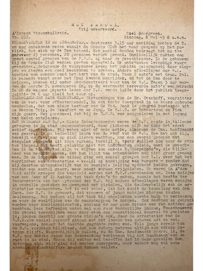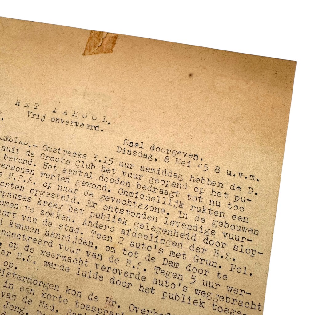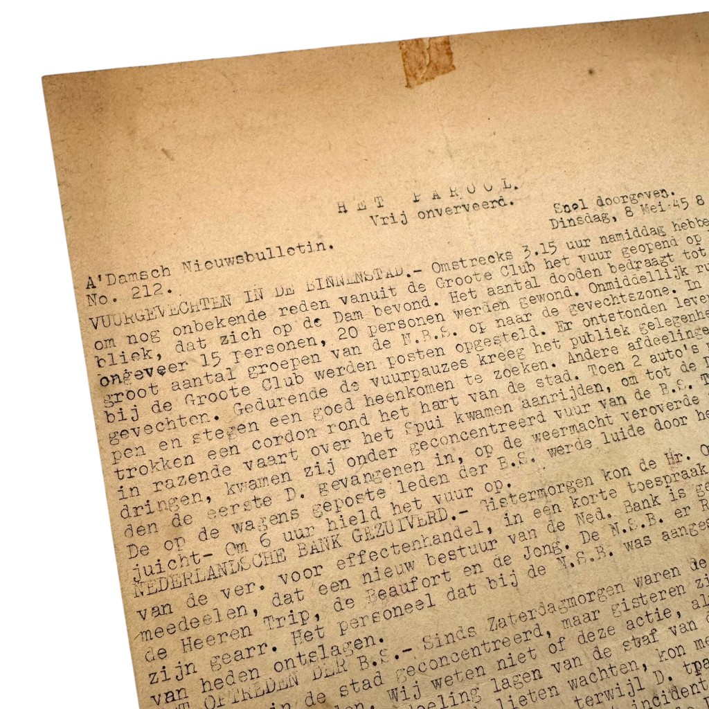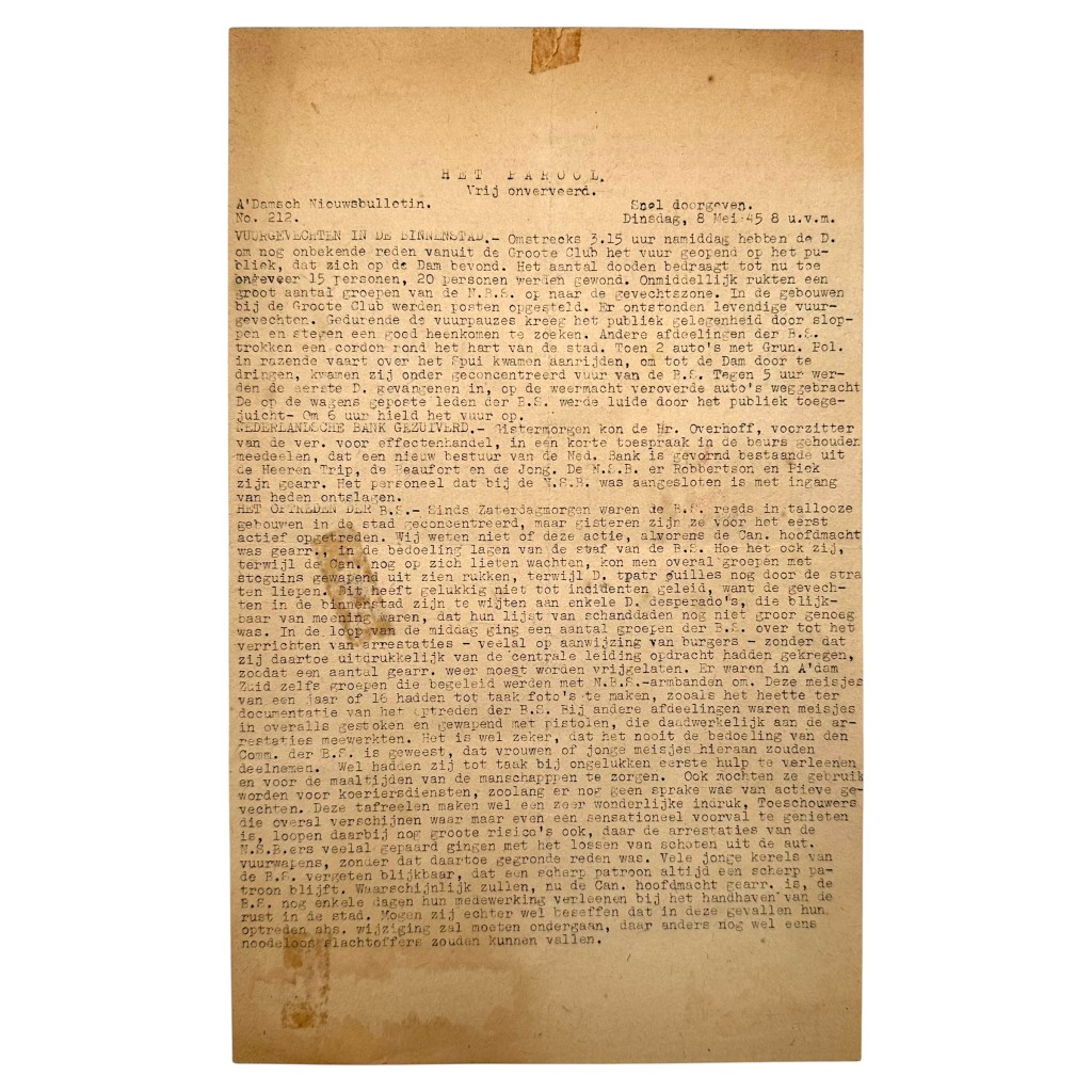 Deze originele verzetsuitgave van Het Parool, gedateerd dinsdag 8 mei 1945 (A’damsch Nieuwsbulletin nr. 212), is een indringend en historisch document uit de dramatische bevrijdingsdagen van Amsterdam. Het gestencilde bulletin werd verspreid in de directe nasleep van de Duitse capitulatie en bevat ooggetuigenverslagen van de chaotische gebeurtenissen in de hoofdstad. Centraal in deze uitgave staat de berichtgeving over de schietpartij op de Dam op 7 mei 1945, waarbij Duitse militairen vanuit de Groote Club het vuur openden op de feestvierende menigte. In het bulletin wordt melding gemaakt van doden en gewonden en wordt de plotselinge omslag van bevrijdingsvreugde naar paniek en geweld indringend beschreven. De tekst verhaalt over de inzet van de Binnenlandse Strijdkrachten, de ontstane vuurgevechten in de binnenstad en de gespannen situatie rond het hart van de stad. Deze gebeurtenis – tegenwoordig bekend als de Dam-schietpartij – geldt als een van de meest tragische incidenten van de bevrijdingsdagen in Nederland. Daarnaast bevat het bulletin actuele berichten over de arrestatie van NSB’ers, de zuivering van instellingen, en internationale ontwikkelingen zoals de capitulatie van Duitsland en de situatie in Praag, Denemarken en Noorwegen. Het exemplaar verkeert in gebruikte staat met duidelijke ouderdomssporen. Interessant voor verzamelaars van verzetsdrukwerk, Tweede Wereldoorlog memorabilia en Amsterdamse oorlogsgeschiedenis.