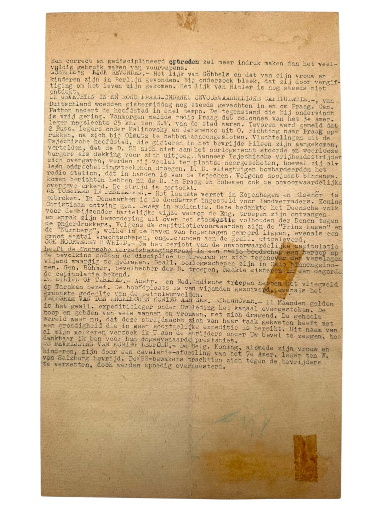 The stenciled bulletin was distributed in the immediate aftermath of the German capitulation and contains eyewitness reports of the chaotic events unfolding in the capital.