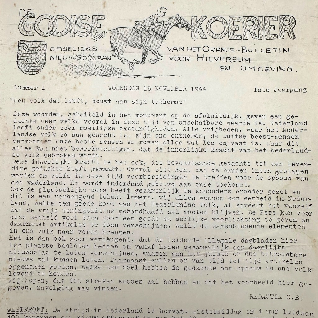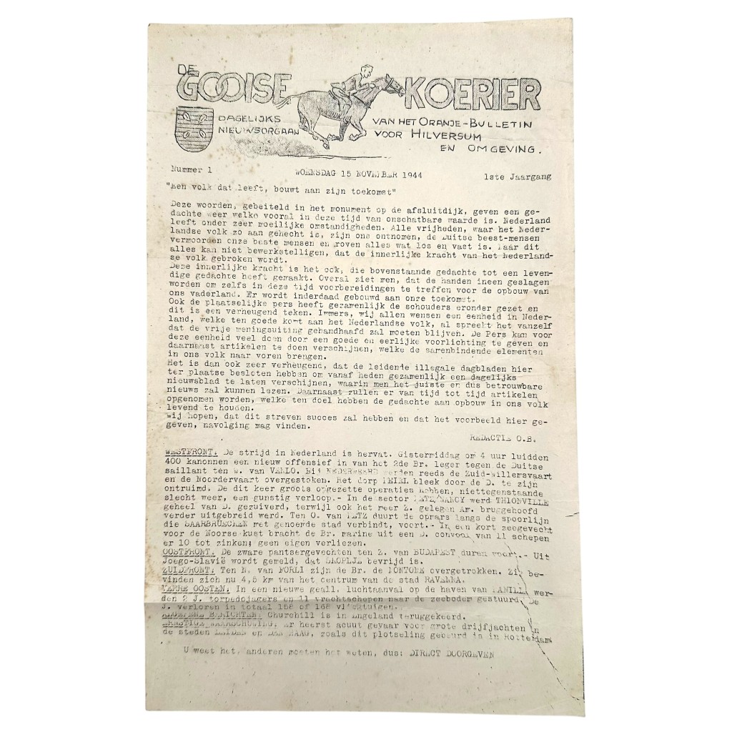 Original WWII Dutch resistance newspaper ‘De Gooise Koerier – Hilversum’ Nr 1