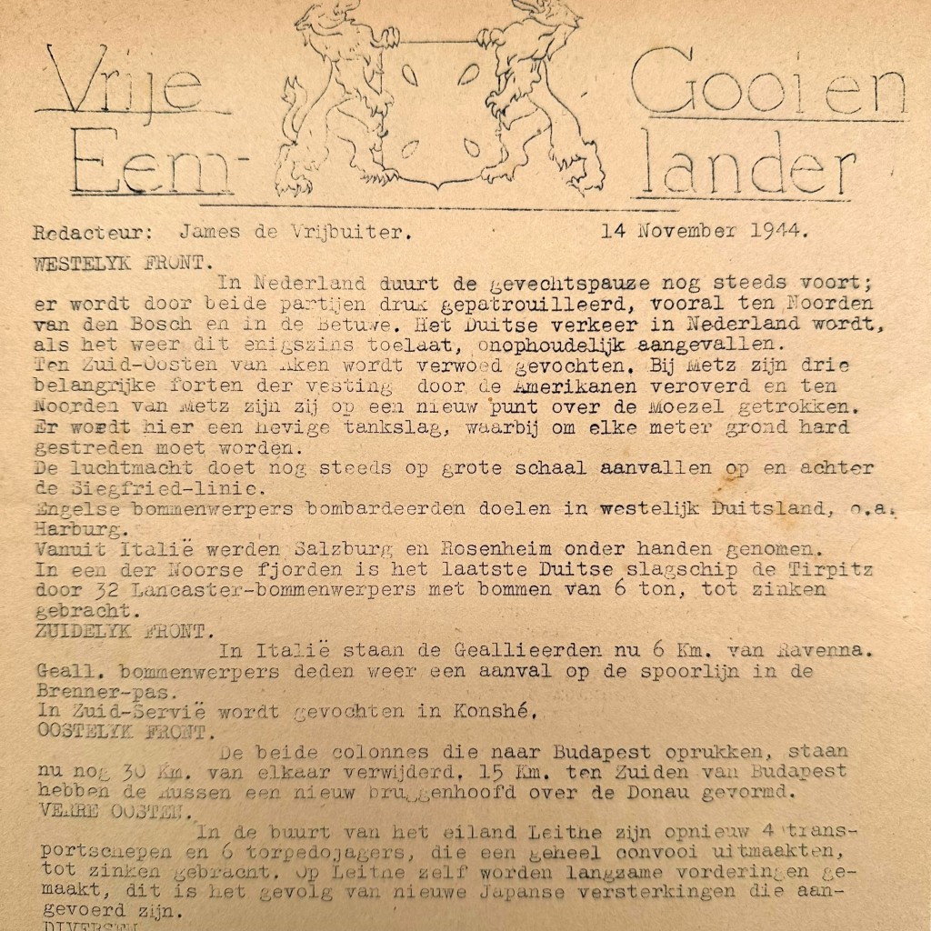 Deze originele Nederlandse verzetskrant De Vrije Gooi en Eemlander is gedateerd 14 november 1944.