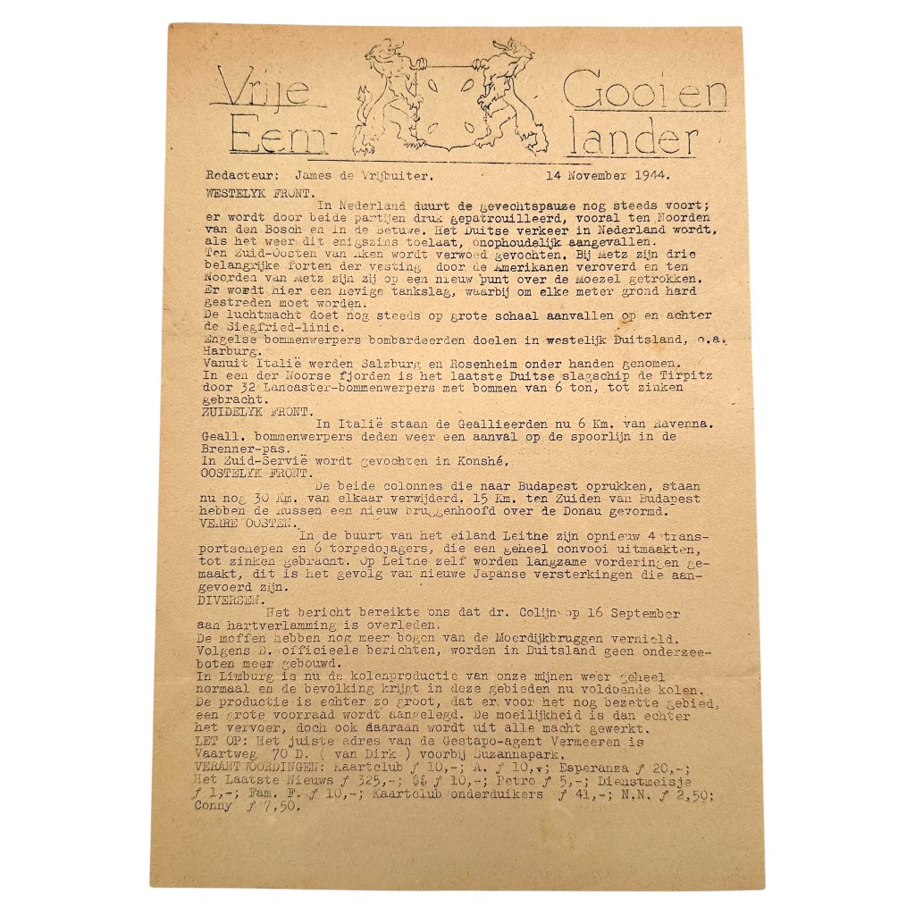 This original Dutch resistance newspaper De Vrije Gooi en Eemlander is dated November 14, 1944.