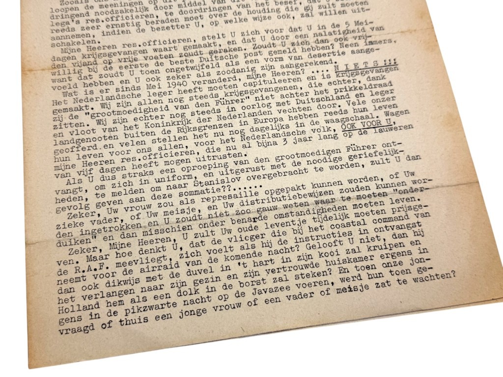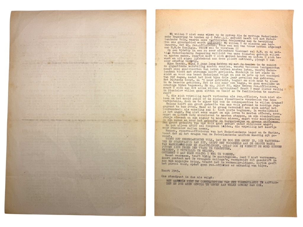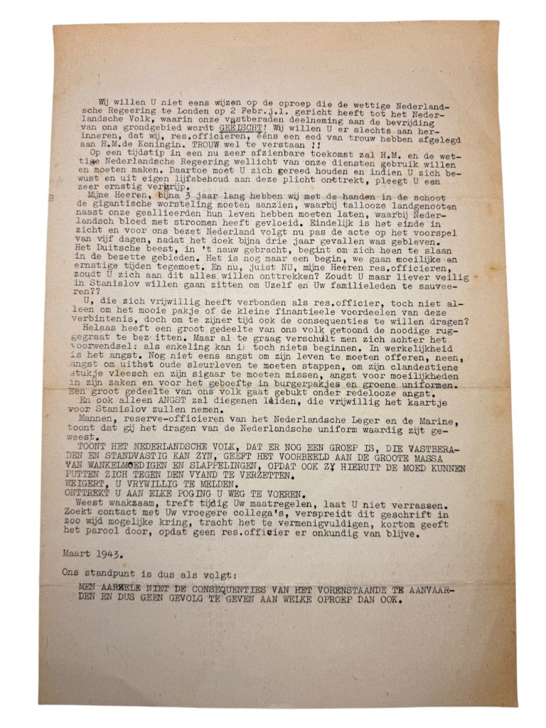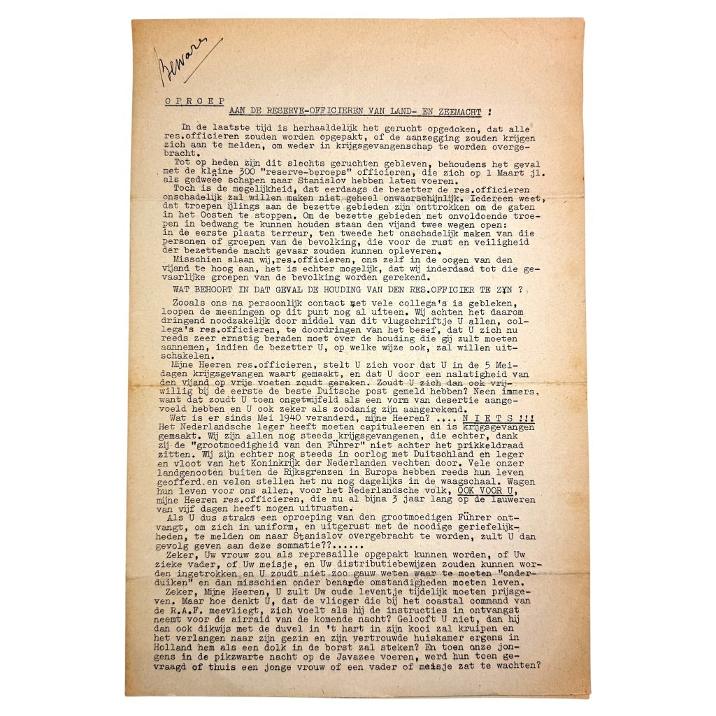Dit zeldzame Nederlandse verzetsdocument dateert uit maart 1943 en was gericht aan de Nederlandse reserve-officieren van land- en zeemacht.