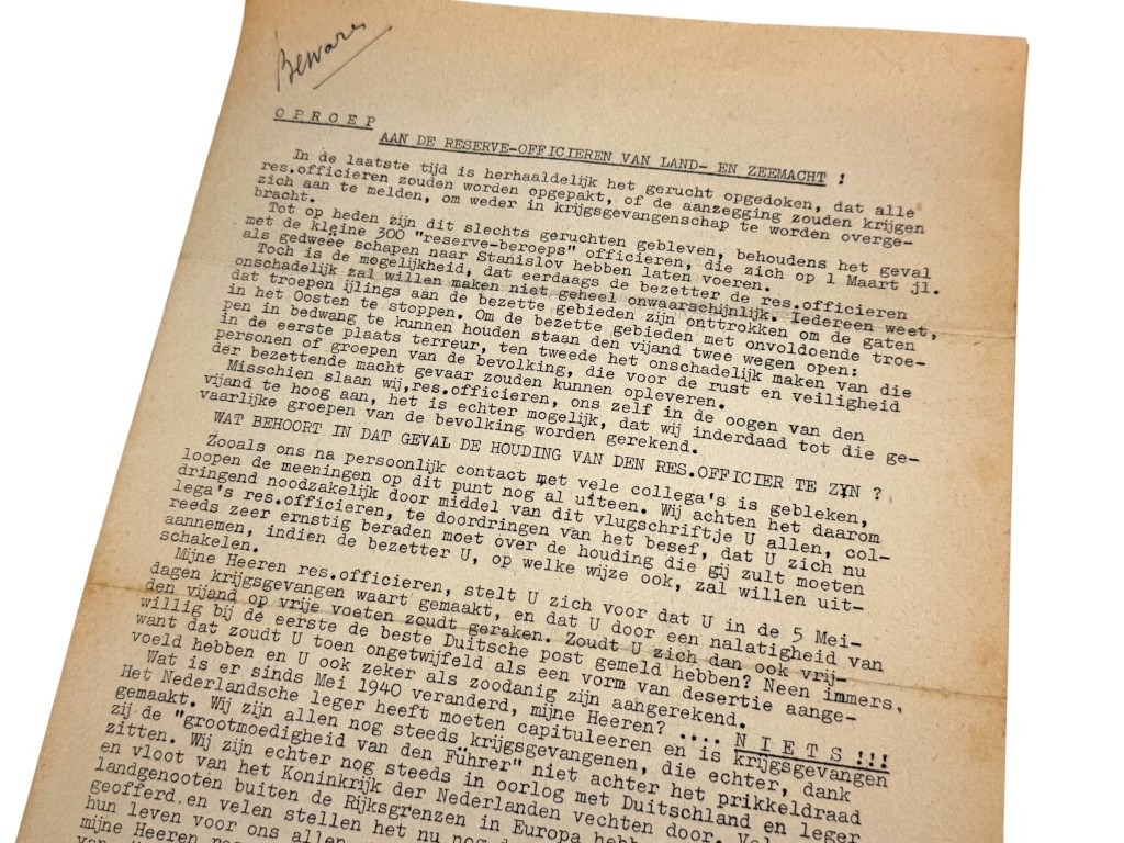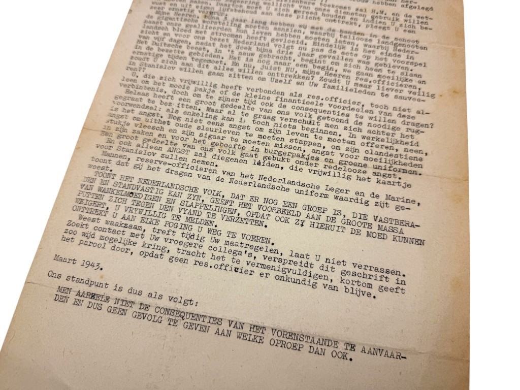 This rare Dutch resistance document dates from March 1943 and was addressed to the Dutch reserve officers of the army and navy.