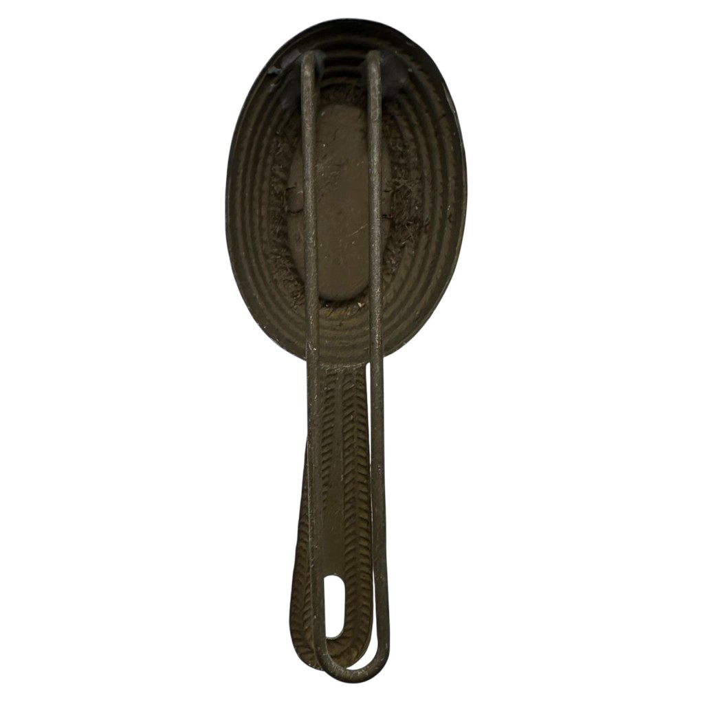 De achterzijde toont de originele bevestigingslippen, waarmee de kokarde op de kepie werd bevestigd.