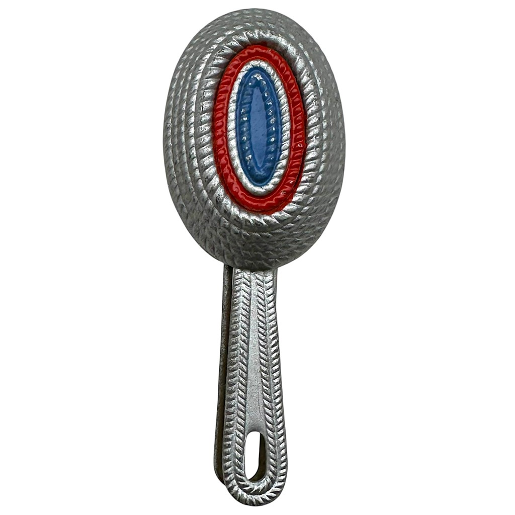 This metal emblem has an oval shape with a red-white-blue cockade, bordered by a silver-colored edge.