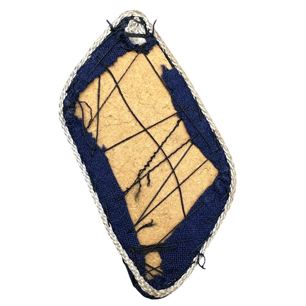 This collar tab is made of dark blue cloth with a twisted silver-colored cord along the edge and features two embroidered stars indicating the officer rank. The piece formed part of the uniform of the Staatspolitie, the police force established during the German occupation, whose personnel were trained at the police training camp in Schalkhaar.