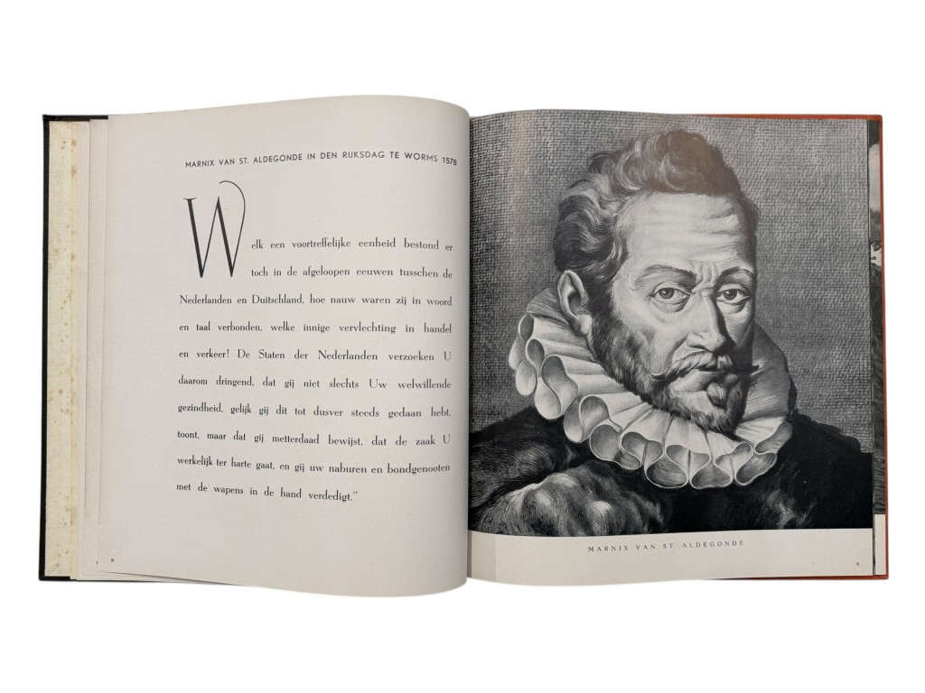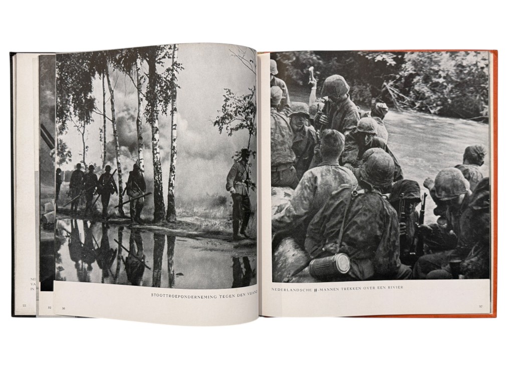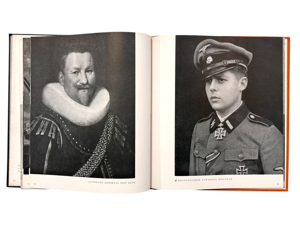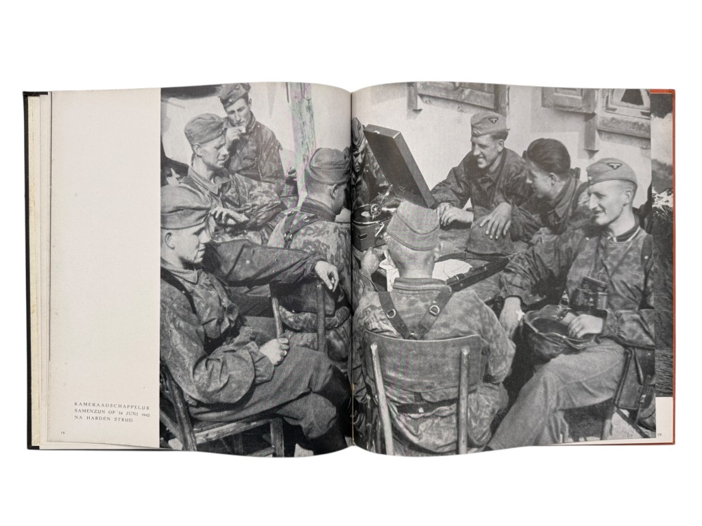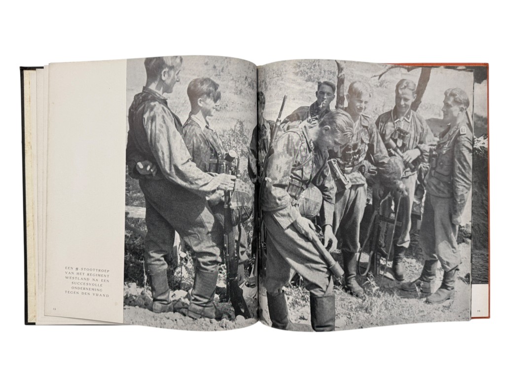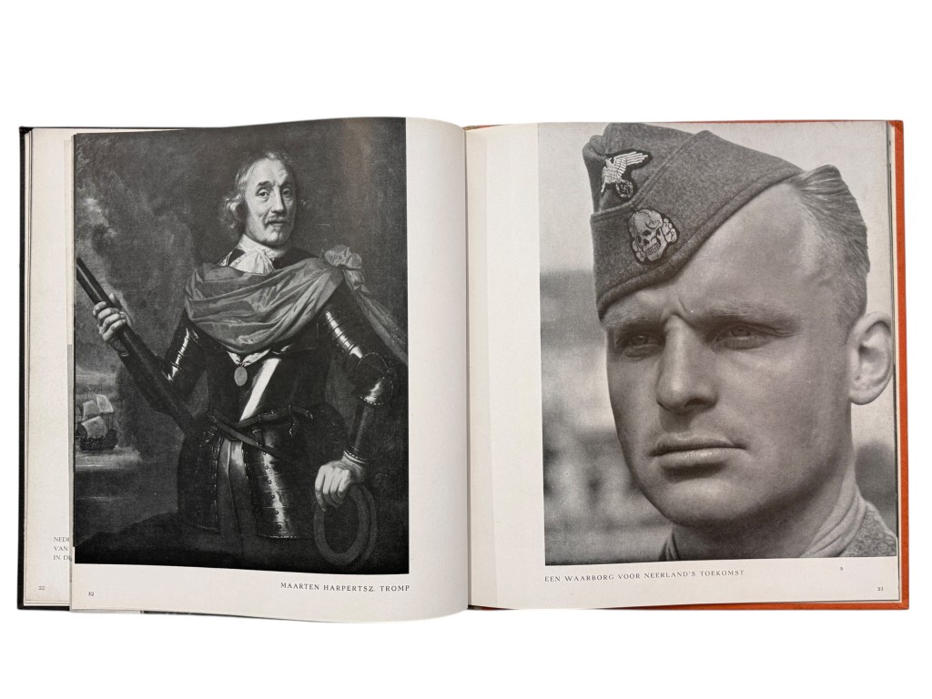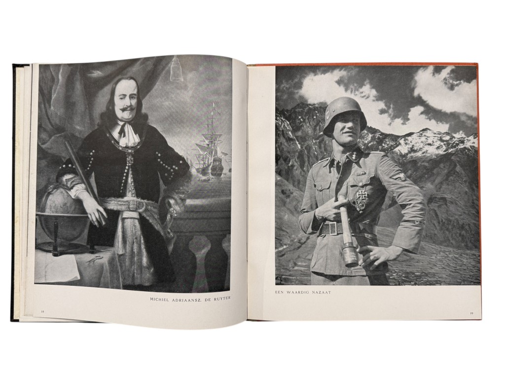 This book, In ’t Verleden Ligt Het Heden, is an original Dutch propaganda publication from the Second World War, produced to support recruitment and image-building efforts for Dutch volunteers within the German SS. The well-designed volume contains a combination of historical portraits, photographs of soldiers from that period, and accompanying texts intended to promote the ideological message of the occupying forces.