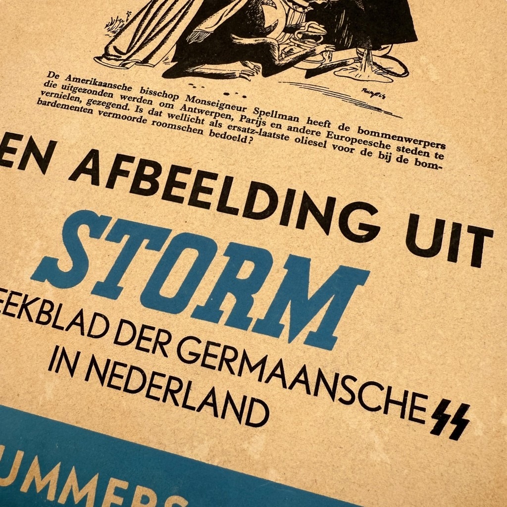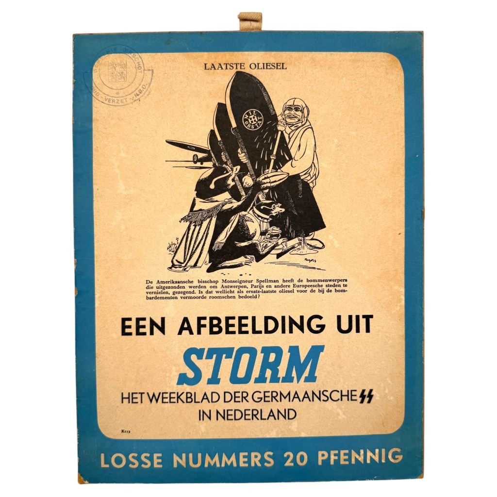 Dit Nederlandse kartonnen raambord is in gebruikte conditie en hing voor het raam in een winkel waar men de collaboratiekrant Storm SS verkocht.