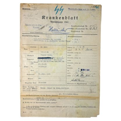 Original WWII Dutch SS Krankenblatt SS-Freiwilligen-Panzergrenadier Brigade ‘Nederland’ from a volunteer from Delfzijl