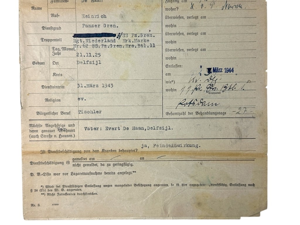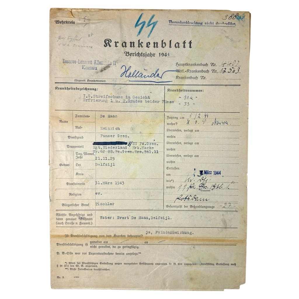 Dit Nederlandse Waffen-SS Krankenblatt is in gebruikte conditie en behoorde tot een SS Panzergrenadier afkomstig uit Delfzijl welke diende in SS-Freiwilligen-Panzergrenadier Brigade ‘Nederland’ en vocht bij Narwa.