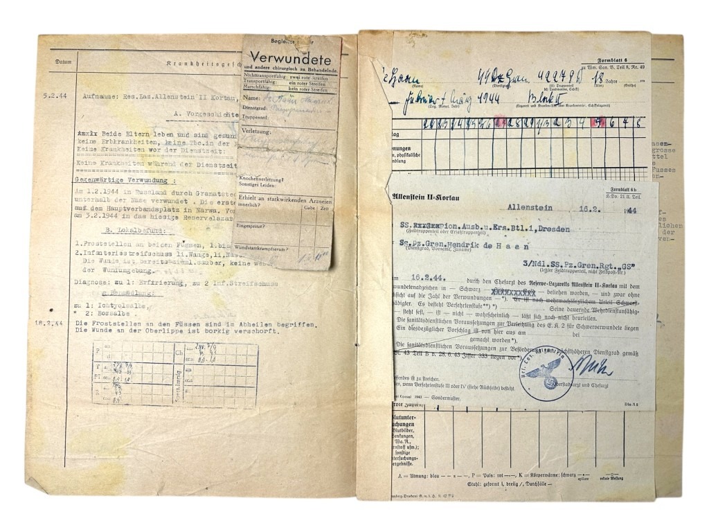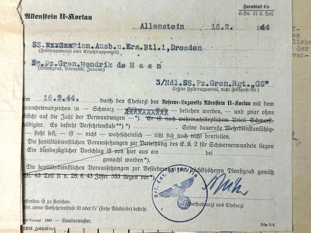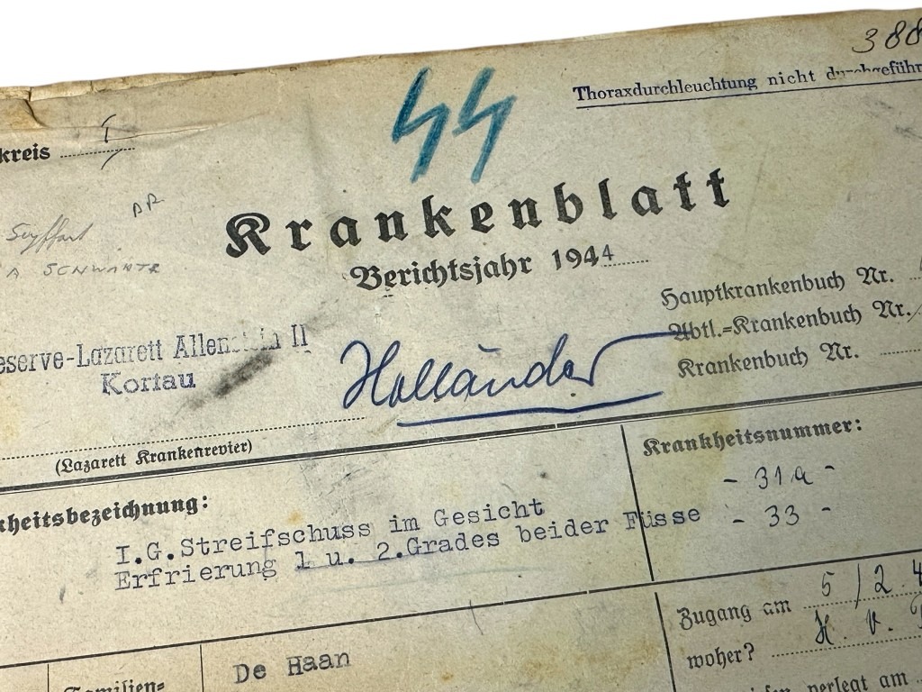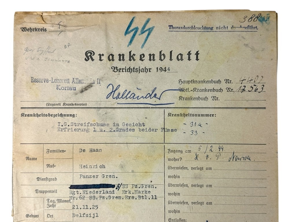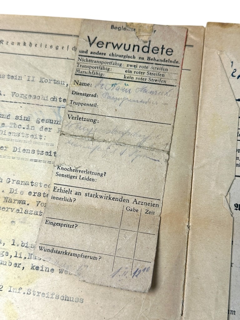 In het SS krankenblatt zit ook nog zijn kartonnen gewonden kaart die op zijn nek hing.