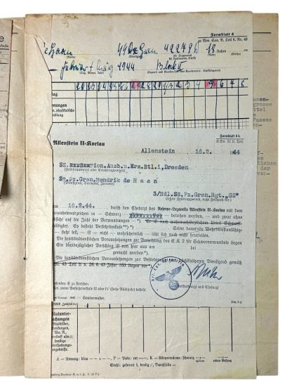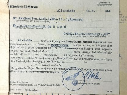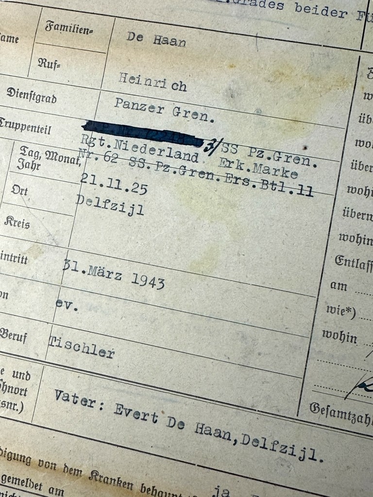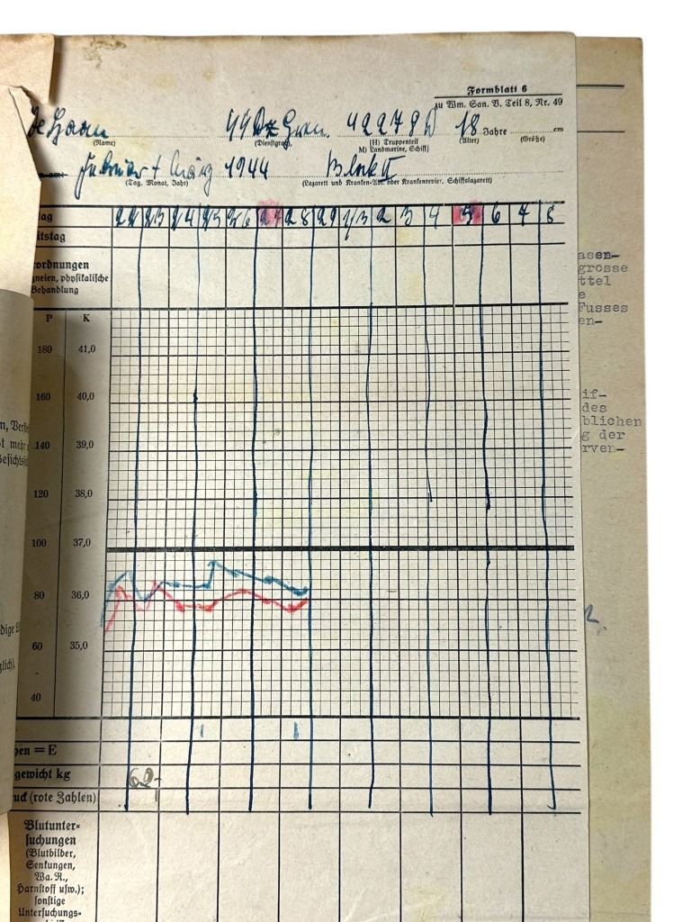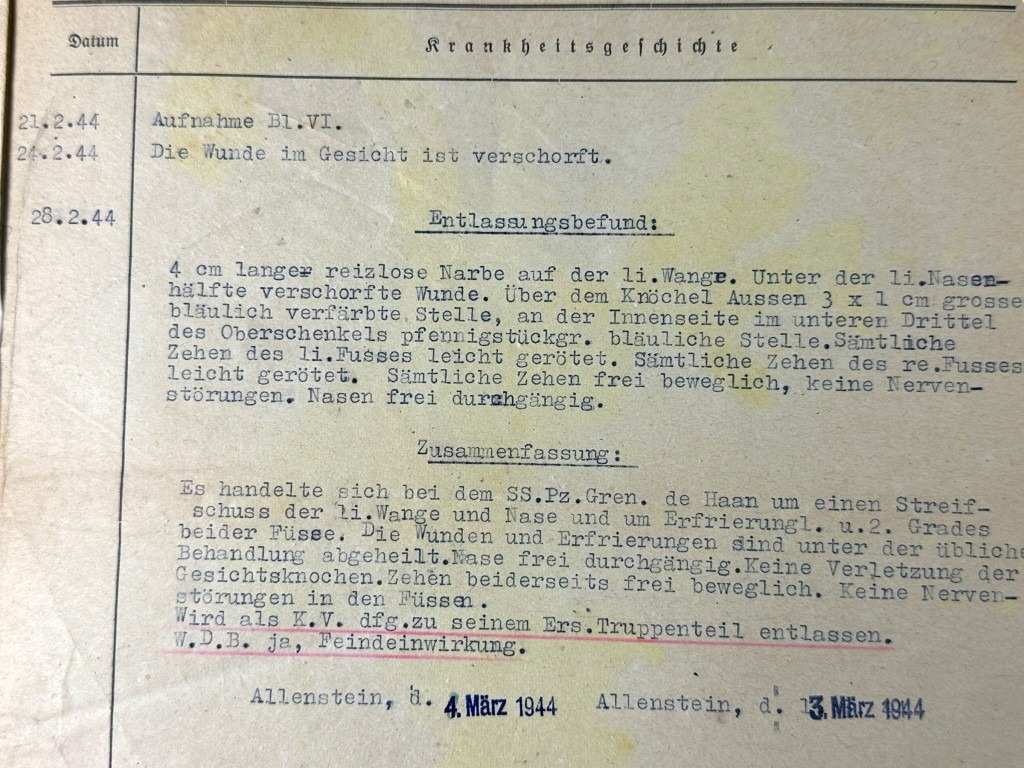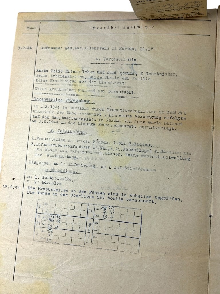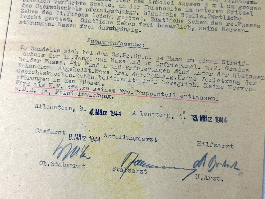 In het SS krankenblatt zit ook nog zijn kartonnen gewonden kaart die op zijn nek hing.