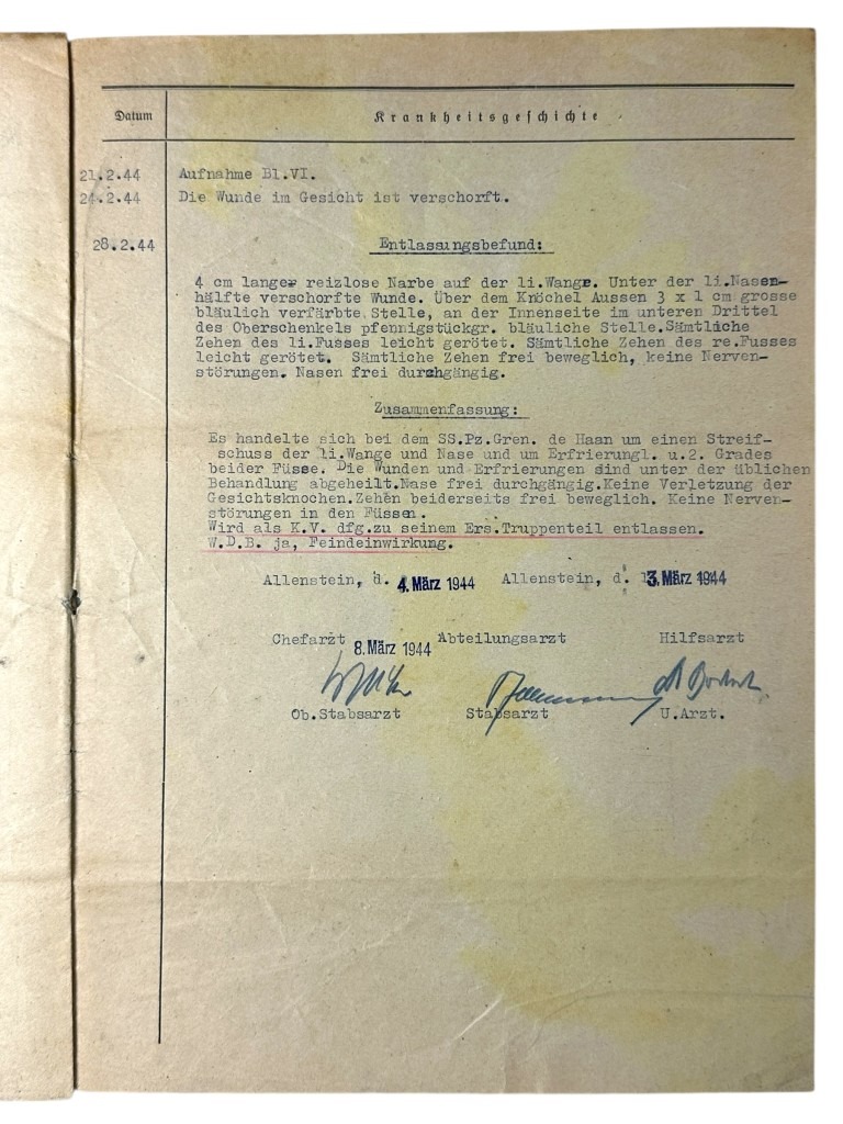 The SS krankenblatt also includes his cardboard wounded card that hung on his neck.