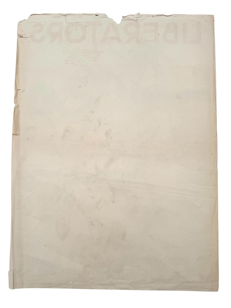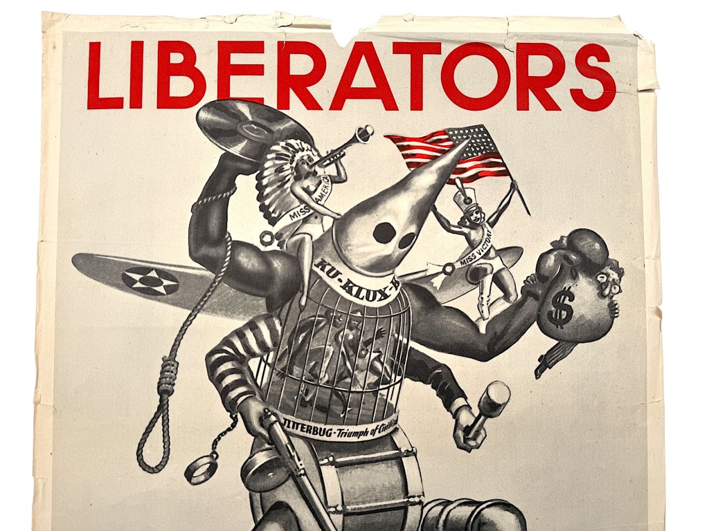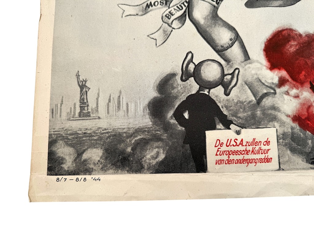 Deze Nederlandse SS-propagandaposter uit 1944, getiteld “Liberators”, is een bijzonder en zeldzaam voorbeeld van felle anti-geallieerde beeldvorming uit de bezettingsperiode. De poster toont een grote, grotesk weergegeven karikatuurfiguur, samengesteld uit stereotypen en politiek-symbolische elementen, bedoeld om de Amerikaanse bevrijders op spottende en vijandige wijze af te beelden.