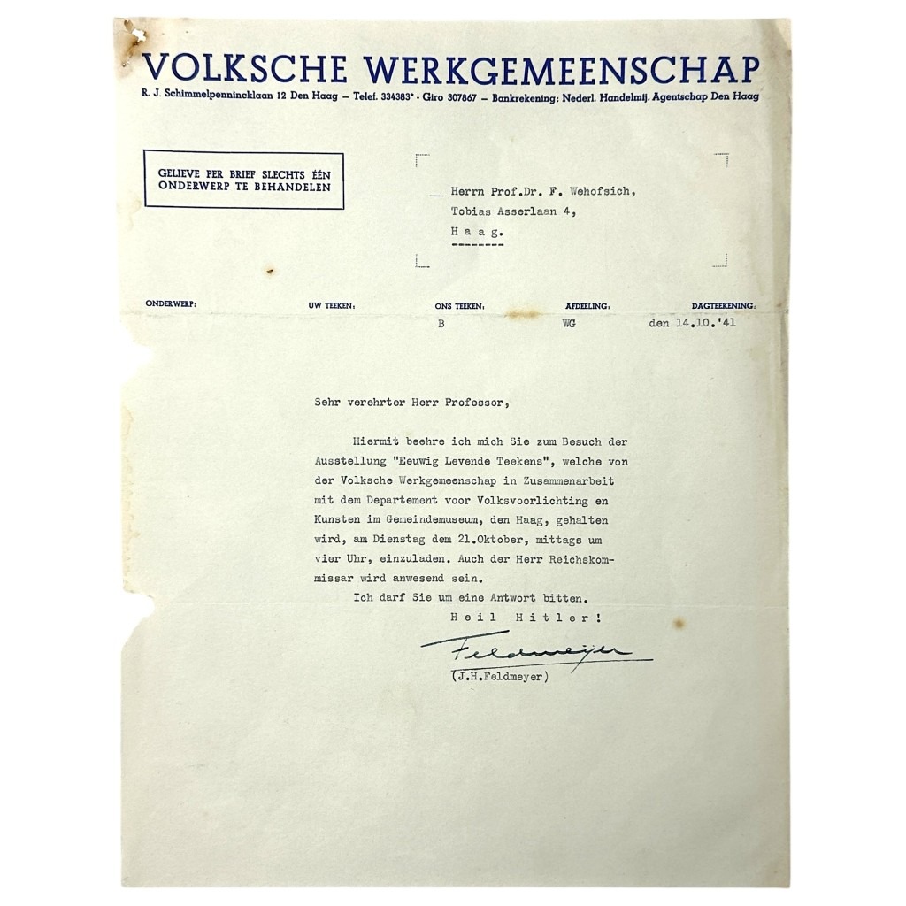 Hiermit beehre ich mich Sie zum Besuch der Ausstellung “Eewig Levende Teekens”, welche von der Volksche Werkgemeenschap in Zusammenarbeit mit dem Departement voor Volksvoorlichting en Kunsten im Gemeindemuseum, den Haag, gehalten wird, am Dienstag den 21. Oktober, mittags um vier Uhr, einzuladen. Auch der Herr Reichskommissar wird anwesend sein.