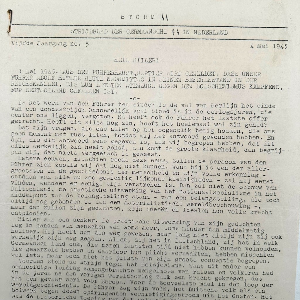 De Nederlandse Storm SS krant is in goede conditie en het betreft de laatste gedrukte editie van 4 mei 1945.