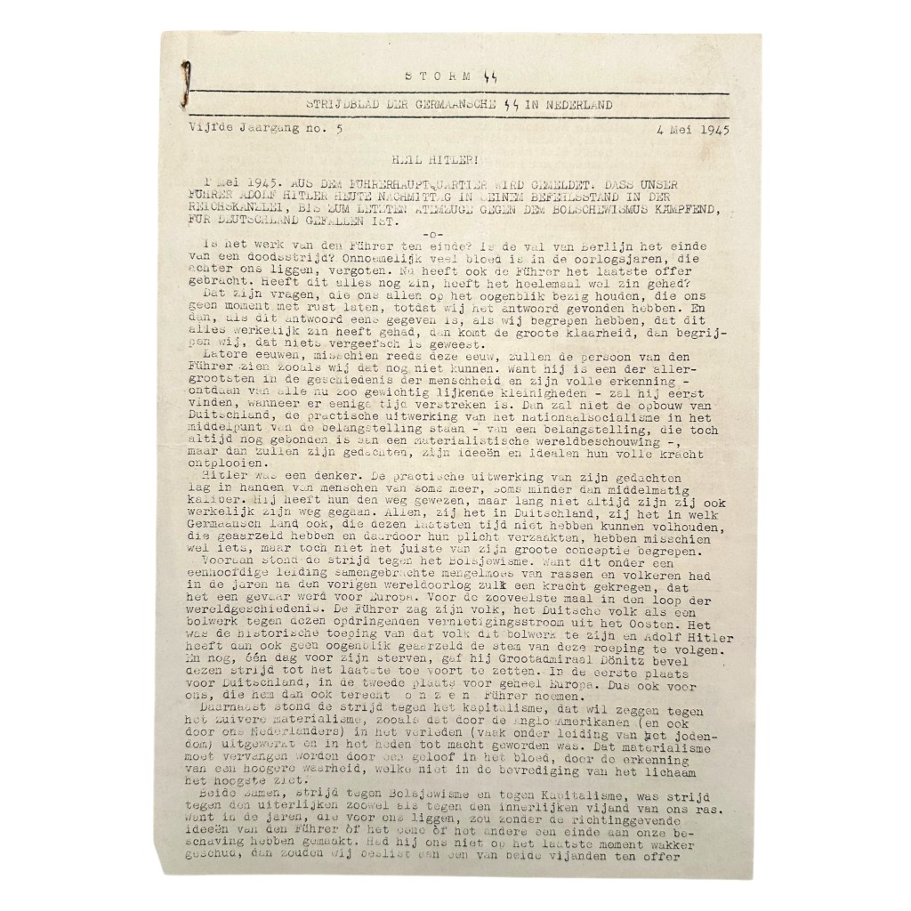 The Dutch Storm SS newspaper is in good condition and it is the last printed edition of May 4, 1945.