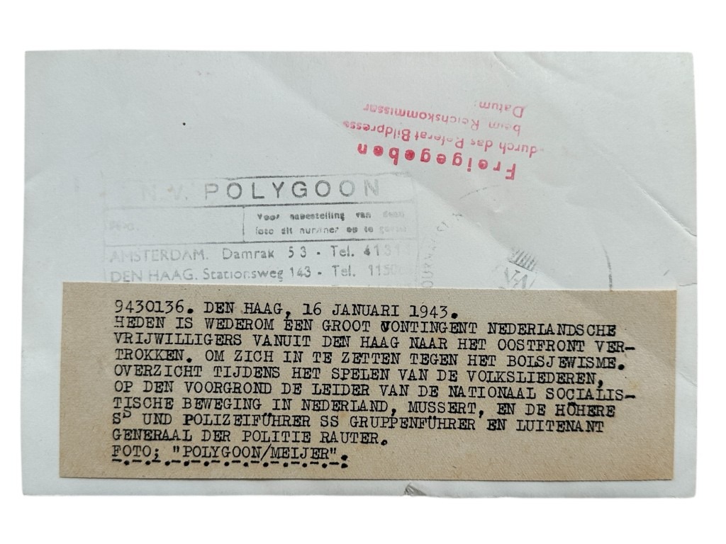 Deze foto is in goede conditie, dateert van 16 januari 1943 en daarop is het vertrek van Nederlandse Waffen-SS vrijwilligers naar het Oostfront te zien in Den Haag.