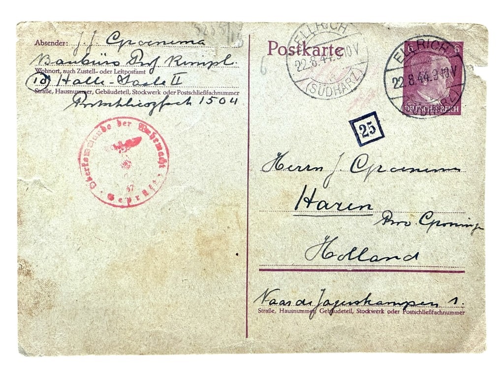 Originele WWII Nederlandse Waffen-SS postkaart SS-Panzergrenadier-Ausbildungs und Ersatz-Bataillon 5 in Ellwangen (Jagst) naar Haren in Groningen