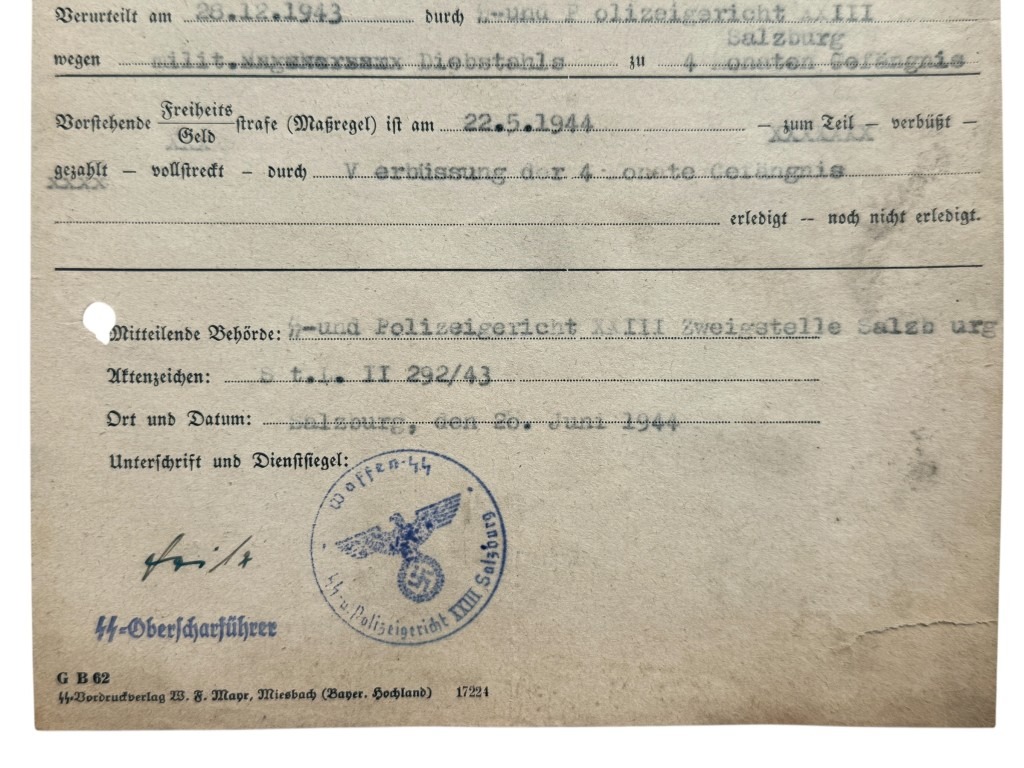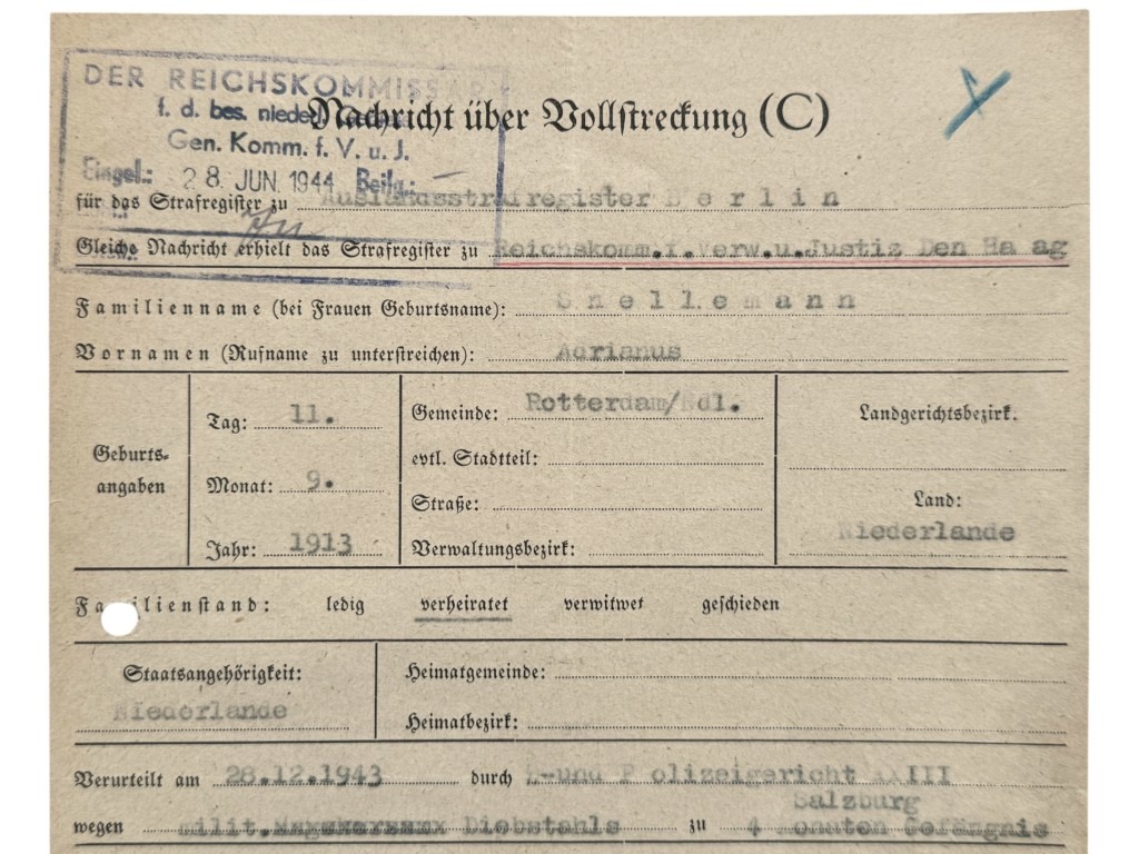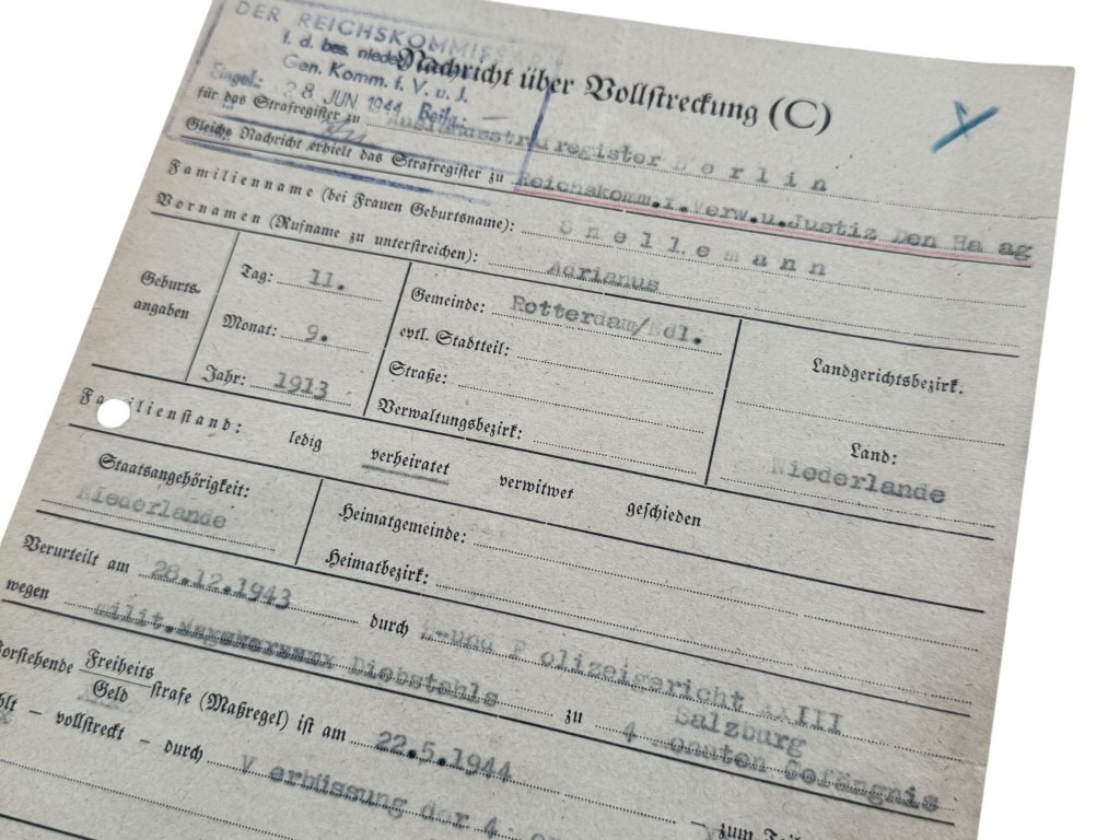 This document is in good condition and belonged to a Dutch Waffen-SS volunteer from Rotterdam who was sentenced to four months in prison for military theft.