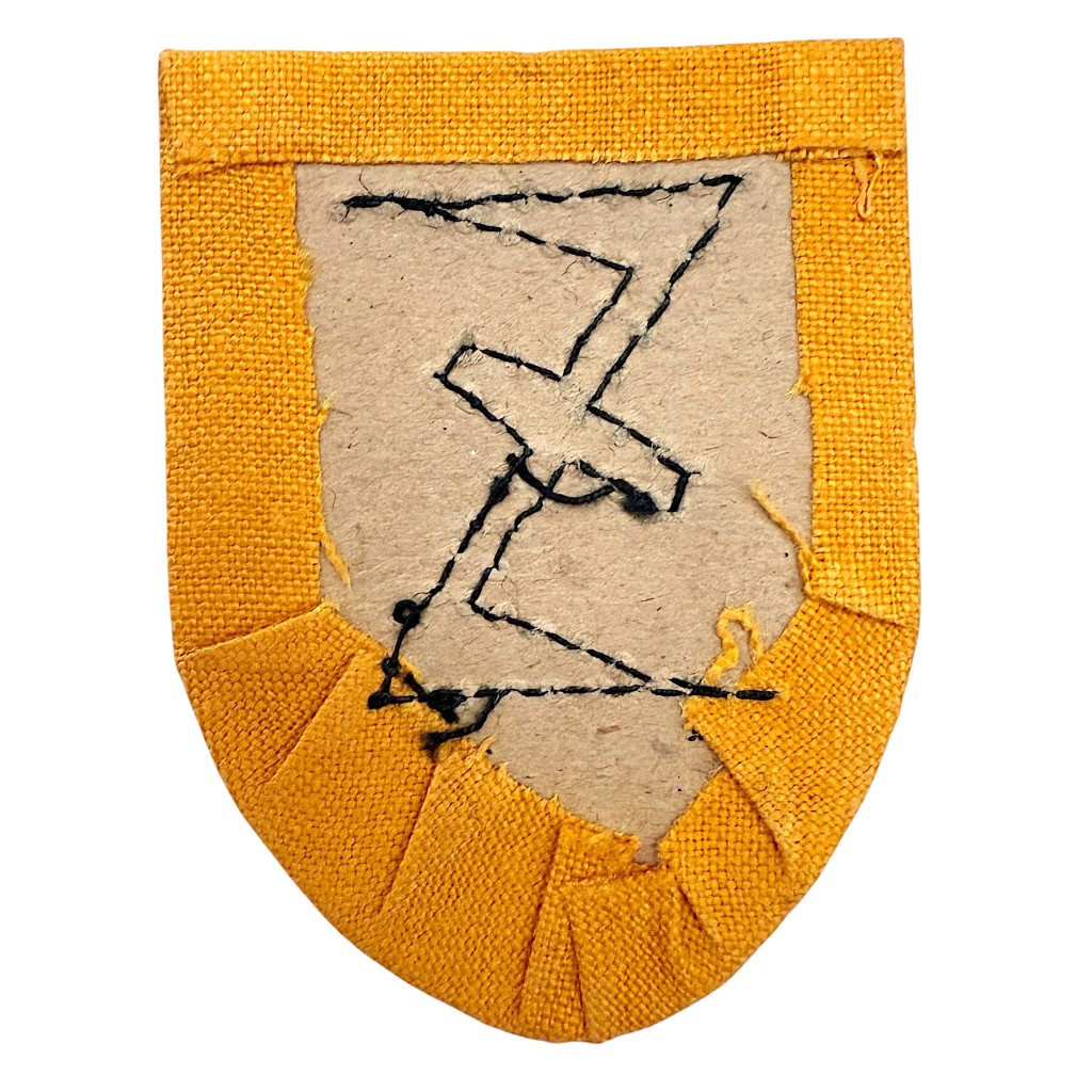 Het felgele schildje met zwart wollen embleem verkeert in goede conditie en toont nog duidelijk de gestikte afwerking aan de achterzijde.
