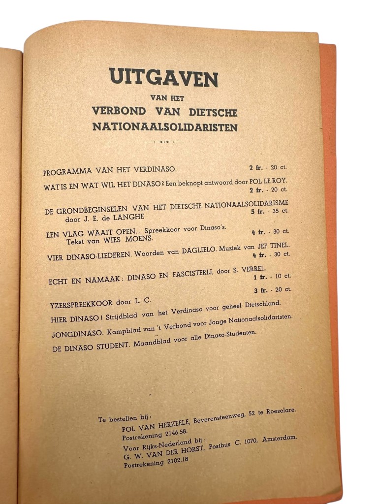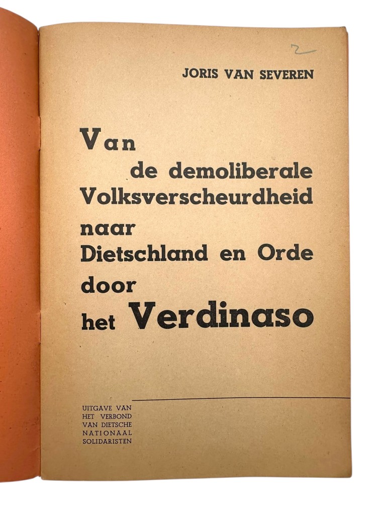This Flemish collaboration brochure, published by the Verbond van Dietsche Nationaalsolidaristen (Verdinaso), contains the text “Van de demoliberale Volksverscheurdheid naar Dietschland en Orde door het Verdinaso” by Joris Van Severen, the leader of the movement.