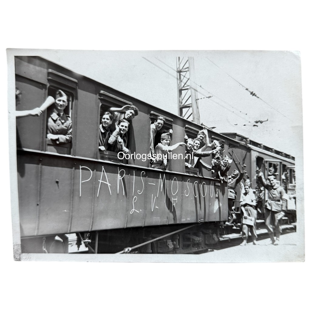 des Volontaires Français (L.V.F.), een Franse vrijwilligersformatie die vanaf 1941 aan Duitse zijde aan het oostfront werd ingezet. De foto laat een groep Franse vrijwilligers zien die uit de ramen van een treinwagon hangen en afscheid nemen, terwijl op de zijkant van de wagon duidelijk de aanduiding “L.V.F.” en de met krijt geschreven tekst “Paris–Moscou” zichtbaar zijn. Dit toont het ideologische en anticommunistische karakter van de eenheid en het doel van hun inzet tegen de Sovjet-Unie. De achterzijde van de foto is voorzien van Franse handgeschreven toelichtingen, persstempels (Paris) en officiële censuur- en goedkeuringsmarkeringen, waaronder een duidelijke datering uit juli 1942. Een historisch interessant object voor verzamelaars, musea en onderzoekers met interesse in de L.V.F., Franse collaboratie en persfotografie uit de Tweede Wereldoorlog.