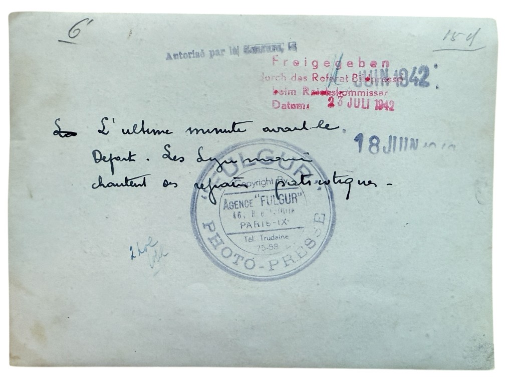 The reverse of the photograph is extensively documented with handwritten French notes, Paris press stamps, and official censorship and approval markings, including a clear date of July 1942.