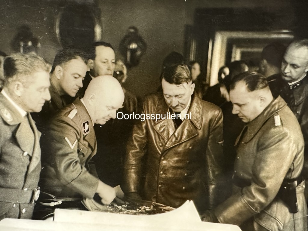 Deze foto is in goede conditie en daarop is Adolf Hitler en verschillende SS officieren op te zien.