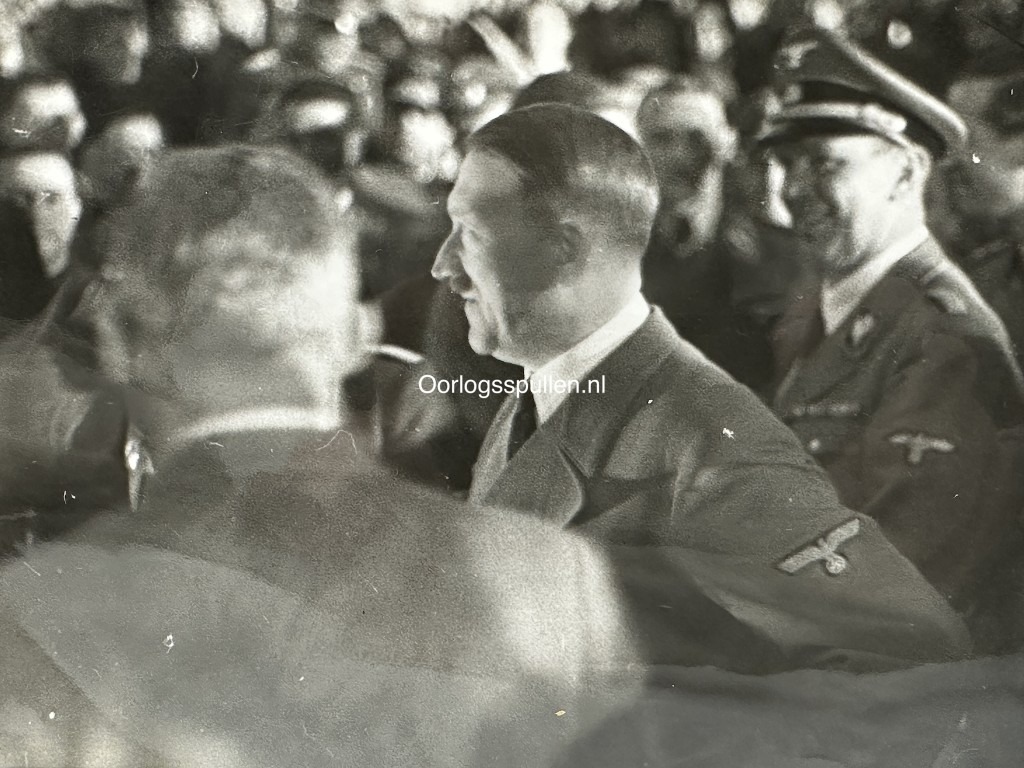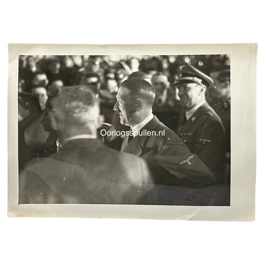 Deze foto is in goede conditie en daarop is Adolf Hitler en verschillende SS officieren op te zien.
