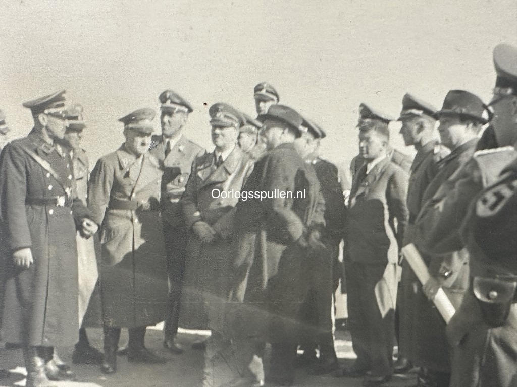 Deze foto is in goede conditie en daarop is Adolf Hitler met verschillende SS officieren en partijleden te zien.