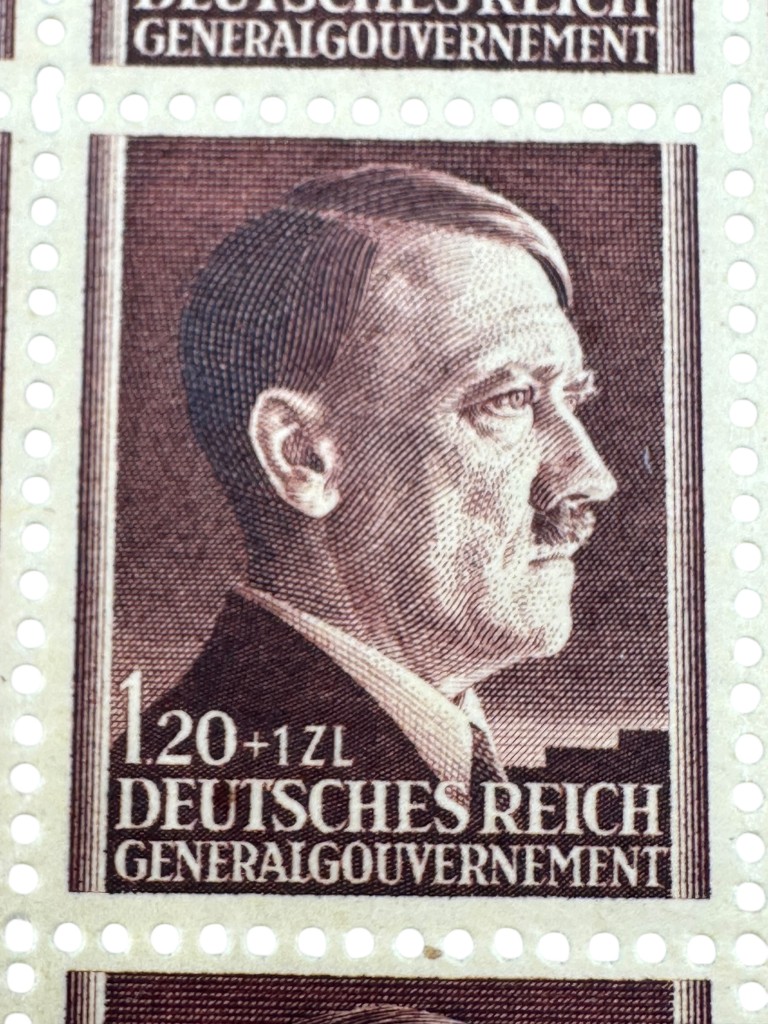 This German stamp sheet from 1942 depicts Adolf Hitler and is a historically interesting collector’s item.