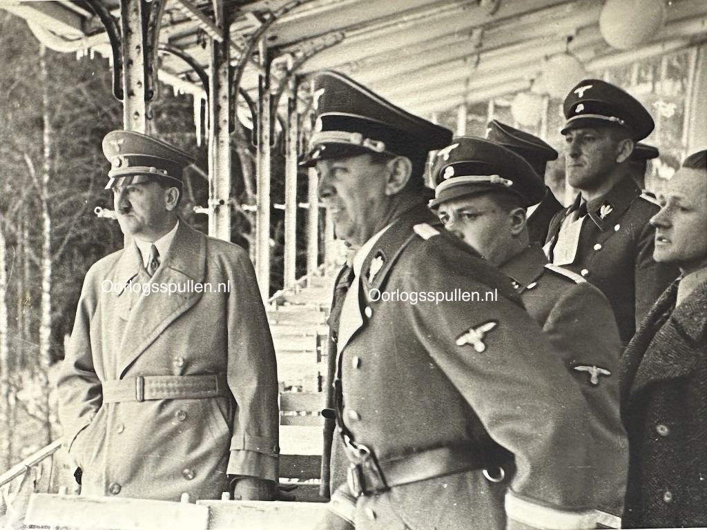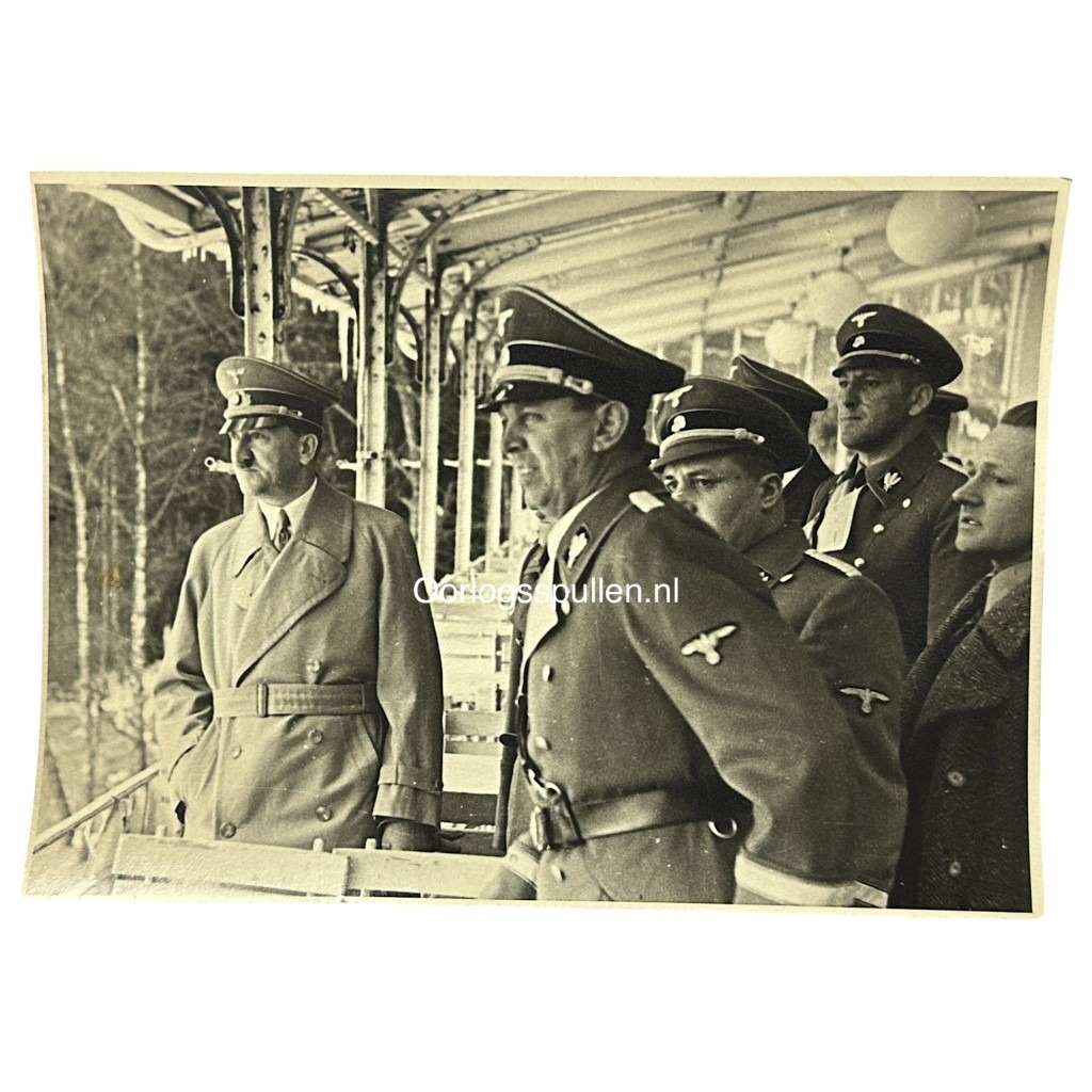 Deze foto is in goede conditie en daarop is Adolf Hitler en verschillende SS officieren op te zien.