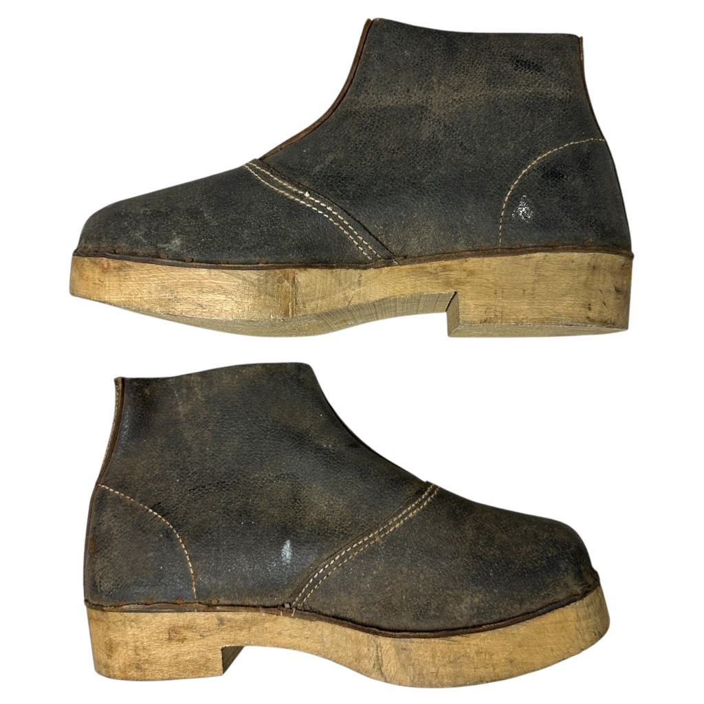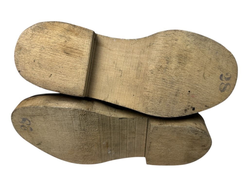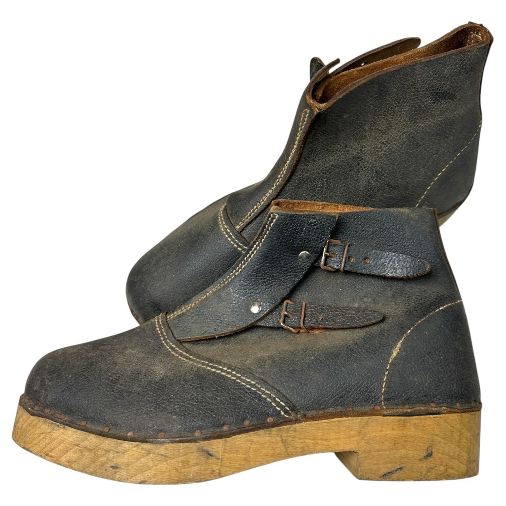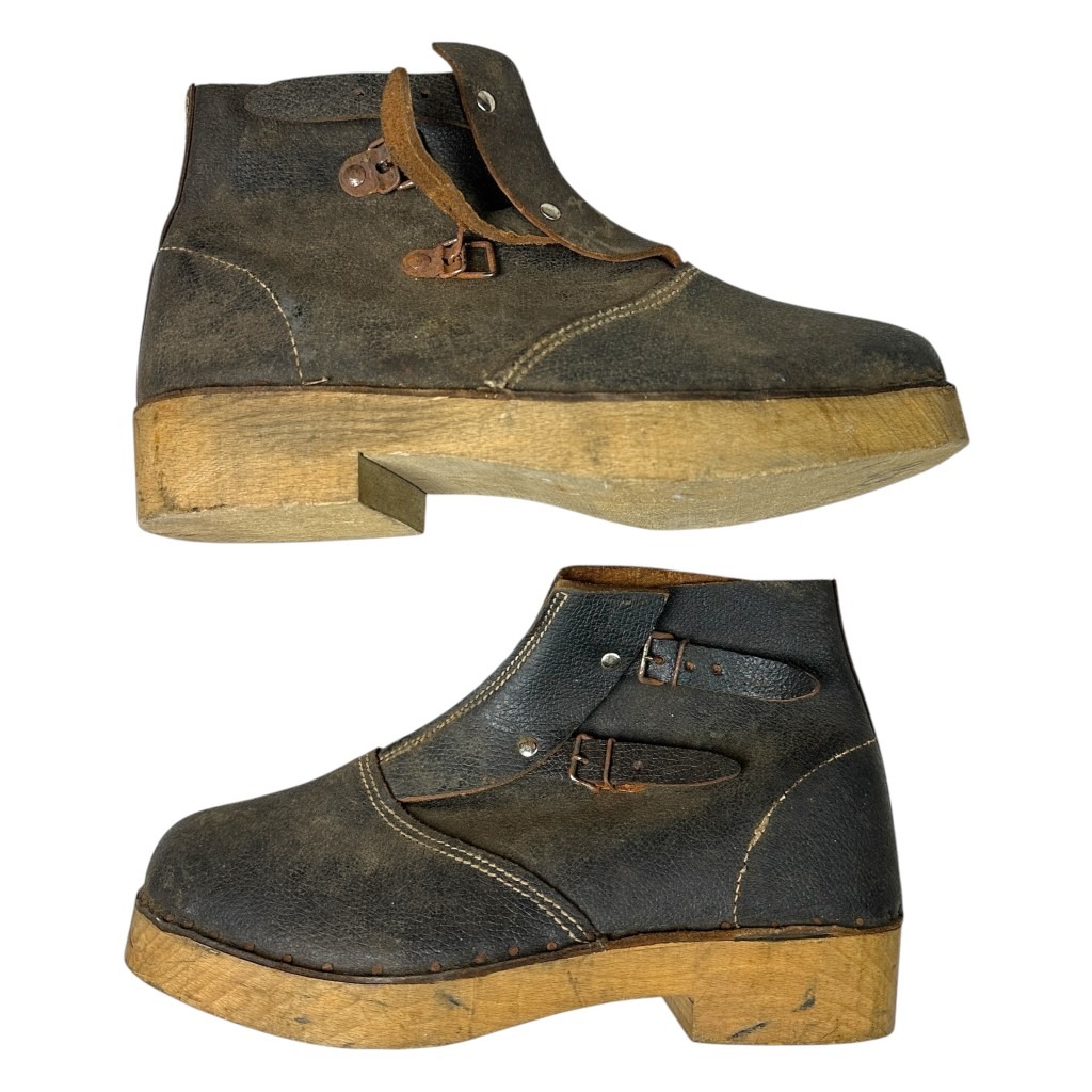 The shoes have wooden soles with leatherwork and this type was worn during the war in various places such as in factories by forced laborers or concentration camp prisoners.